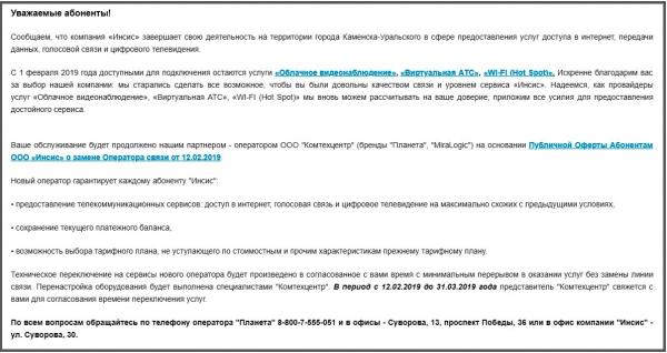 «Инсис» завершает свою деятельность на территории города Каменска-Уральского в сфере предоставления услуг доступа в интернет, передачи данных, голосовой связи и цифрового телевидения Техническое переключение на сервисы нового оператора будет произведено без замены линии связи с минимальным перерывом в оказании услуг. Перенастройку оборудования выполнят специалисты «Комтехцентра», которые свяжутся с пользователями в период с 12 февраля до 31 марта», - говорится на официальном сайте компании.