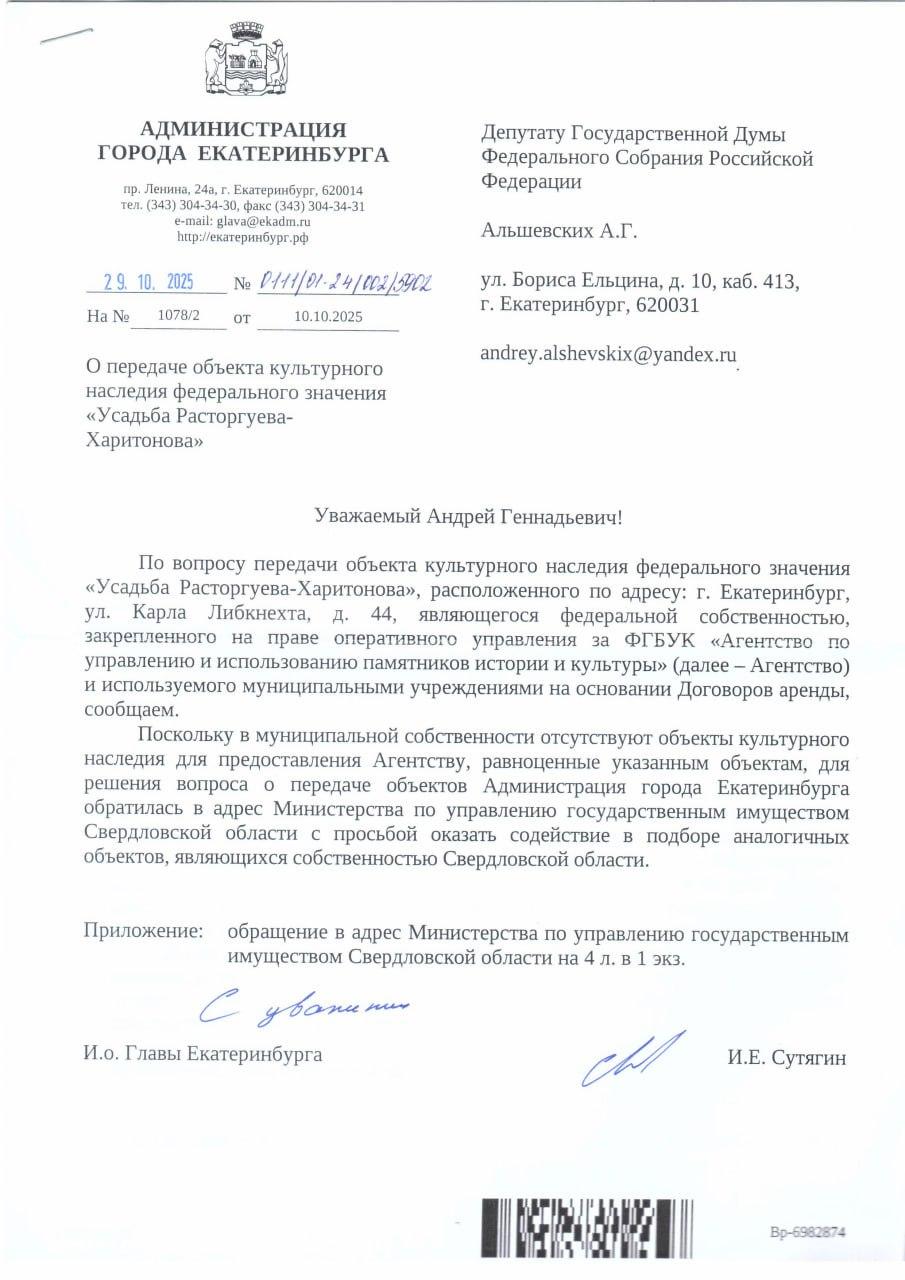 «Поскольку в муниципальной собственности отсутствуют объекты культурного наследия для предоставления Агентству, равноценные указанным объектам, для решения вопроса о передаче объектов администрация города Екатеринбурга обратилась в адрес министерства по управлению государственным имуществом Свердловской области с просьбой оказать содействие в подборе аналогичных объектов, являющихся собственность Свердловской области», - сообщил и.о. главы Екатеринбурга Игорь Сутягин.