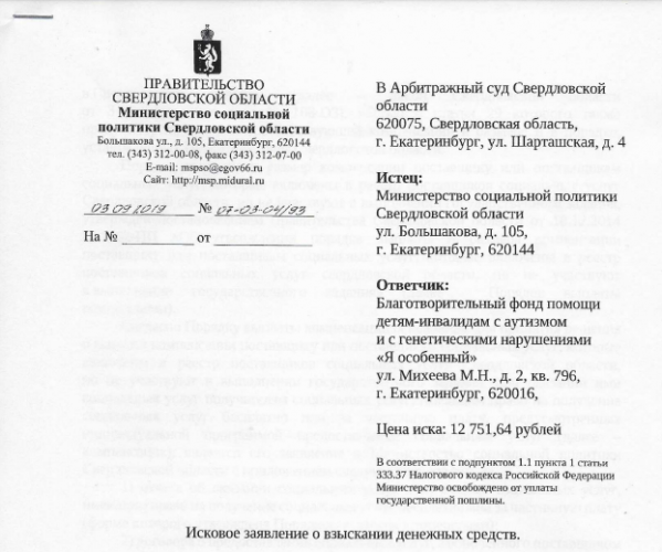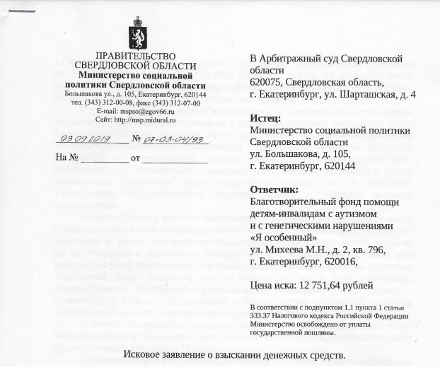 Министерство социальной политики Свердловской области подало иск о взыскании 12 тысяч рублей с фонда «Я особенный», в котором оказывают помощь детям с нарушениями в развитии. Об этом корреспонденту агентства новостей JustMedia.ru сообщили в благотворительной организации.