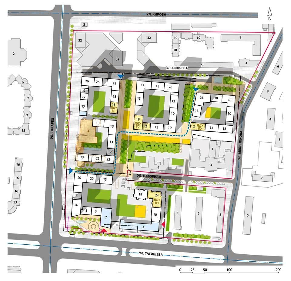 «С одной стороны, на площадке завода есть промышленная территория для реновации. С другой стороны, нужно позаботиться не только о комфорте тех, кто поселится в новом ЖК, но и о тех, кто уже живет в этом квартале. Нам было важно обеспечить доступную благоустроенную среду и предложить при этом оригинальные архитектурные решения, не забыв об идентичности места. Для этого мы решили организовать пешеходный бульвар от перекрёстка улиц Татищева и Токарей в сторону парка XXII партсъезда, а также предложили реновировать ДК «Металлистов», который вполне может претендовать на роль районного культурно-развлекательного коммьюнити-центра», - говорит главный архитектор бюро In.Form, которое разрабатывало проект, Тимур Абдуллаев.