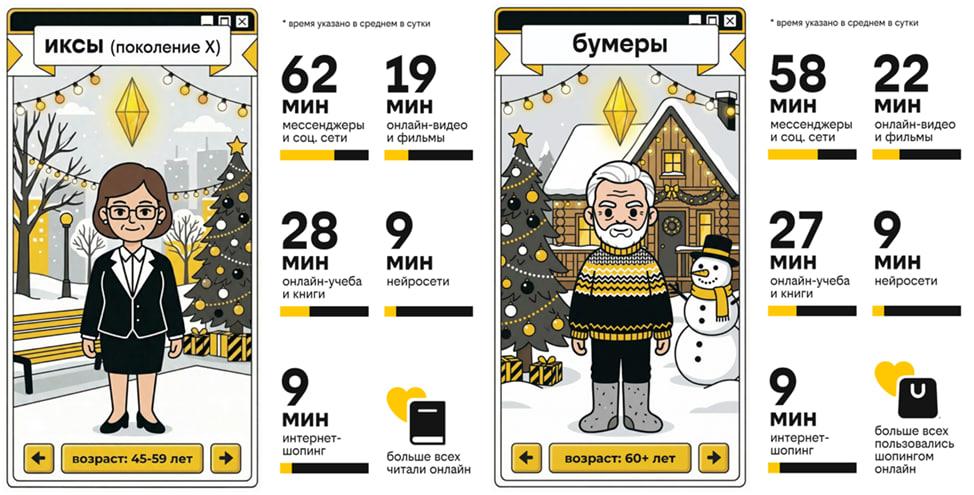 Безусловно, все поколения пользовались разнообразными сервисами – от соцсетей и маркетплейсов до игр и видеосервисов. Самую высокую активность в интернете на новогодних каникулах в Екатеринбурге показали зумеры. В среднем каждый представитель молодежи проводил в интернете почти 6 часов в день. На втором месте по активности – миллениалы, они сидели в различных приложениях в среднем по 5 часов 37 минут. Представители поколения Х и бумеры уделяли интернет-жизни немногим меньше: 5 часов 30 минут и 5 часов 19 минут соответственно.