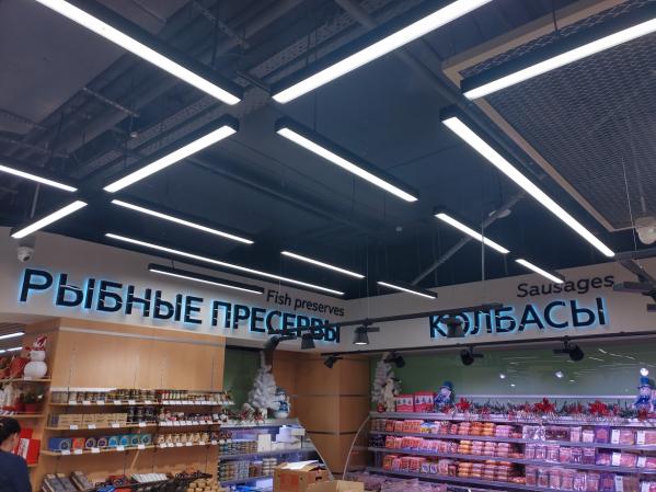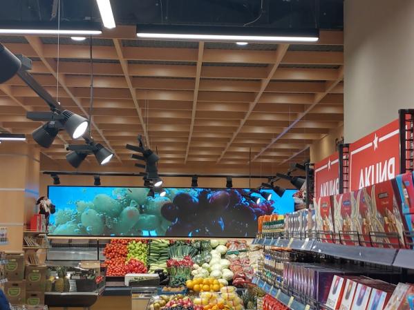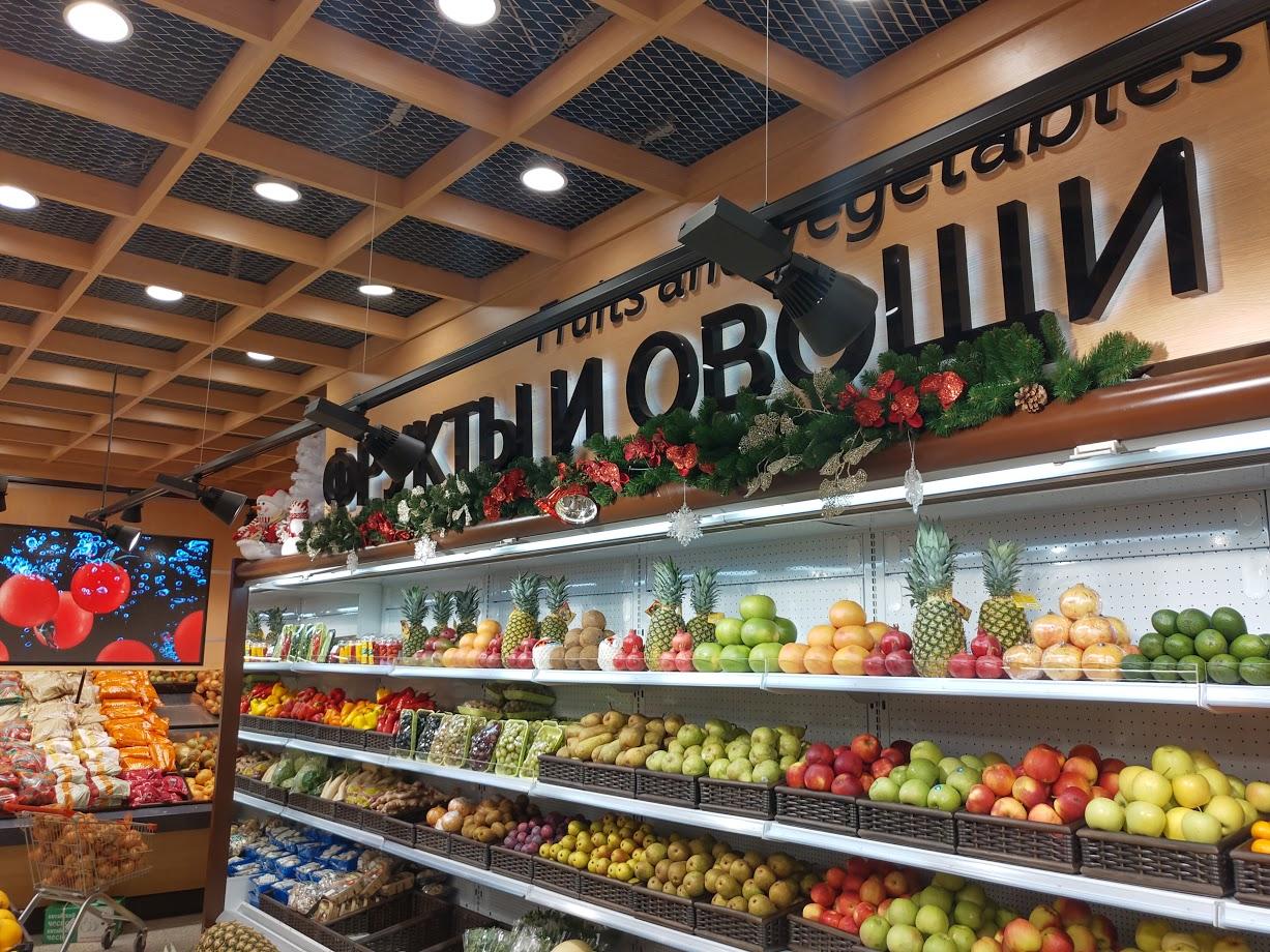 Интерьер новой «Гиперболы» в стиле хай-тек немного напоминает «Гринвич», но дополнен современными технологическими решениями, которые сегодня в тренде. Просто ритейлеры их пока используют нечасто. Это интерактивная навигация и огромные мультимедийные экраны в торговом зале. Так, один будут встречать гостей на входе в отделе «Фрукты и овощи», второй, имитирующий морское дно, – в отделе «Рыба».