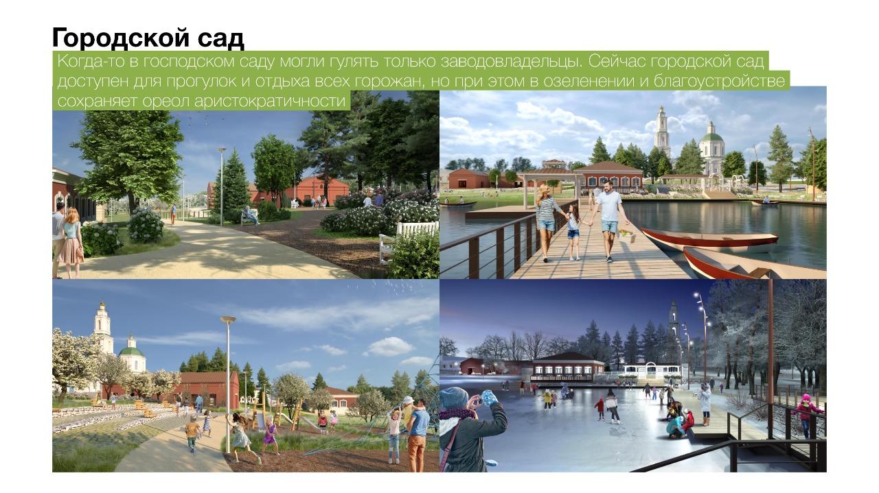 Предполагается, что вместе с заводом будут развиваться и другие элементы горнозаводского города: господский дом с садом, храм, городской пруд и гора. Вокруг этих знаковых объектов должна сложиться современная комфортная инфраструктура гостеприимства – появиться рестораны, кафе, гостиницы, прогулочные зоны и так далее. Таким образом, к реализации проекта подключится малый и средний бизнес.