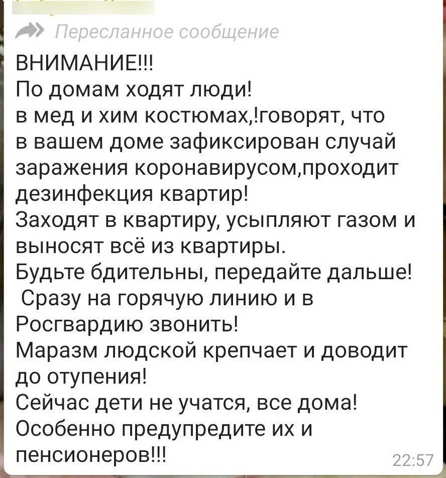 Еще одна рассылка предупреждает свердловчан о всплеске квартирных краж. Якобы злоумышленники представляют специалистами по дезинфекции жилых помещений и грабят доверчивых горожан. Эта информация тоже не нашла подтверждения. Обходы квартир совершают лишь участковые врачи и только в случаях, когда у кого-то из соседей подтвердился коронавирус. В таких случаях, удостовериться в том, что к вам пришел именно врач, можно не открывая дверь, уточнив у него ФИО и связавшись с поликлиникой по месту жительства.