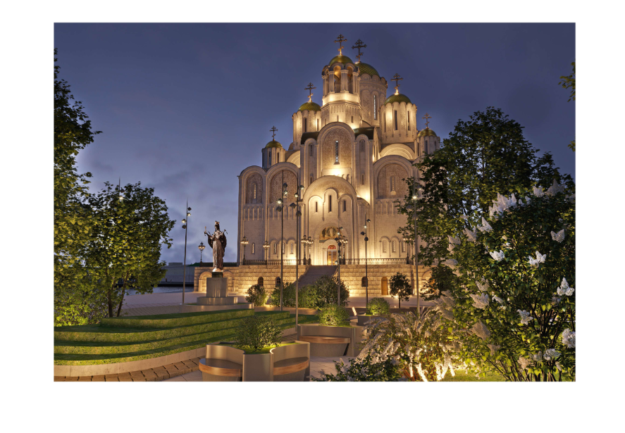 Высота храма составит 66 метров, ширина — 57 метров. Он расположится на набережной в сквере рядом с драмтеатром. Согласно опубликованному эскизу, на цокольном этаж будет склад для баков со святой водой, другие технические помещения и отдельный вестибюль для патриарха и митрополита.