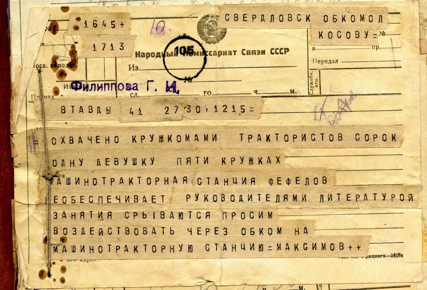 | Телеграмма Верхне-Тавдинского Районного комитета ВЛКСМ в Свердловский обком ВЛКСМ |