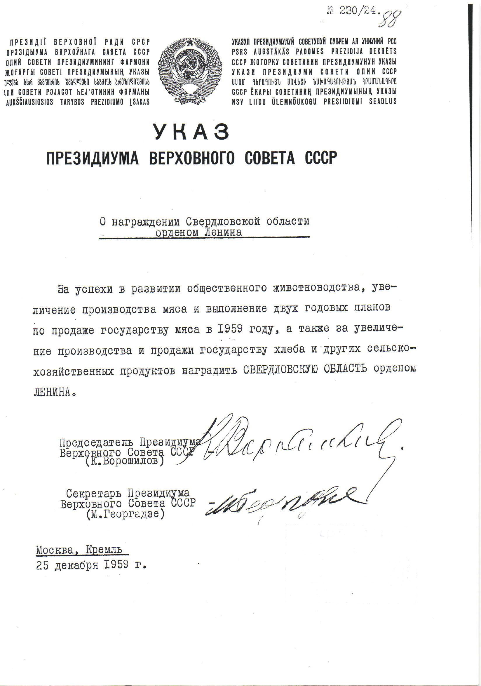 | Указ Президиума Верховного Совета СССР о награждении Свердловской области Орденом Ленина. 25 декабря 1959 года |