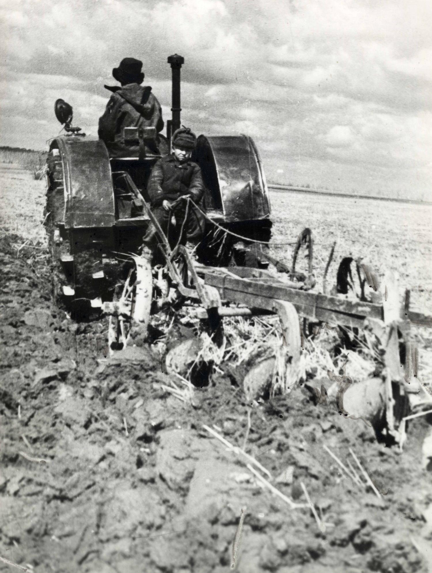 | Тракторист К.А. Шестаков и сцепщик И.Г.Смирнов, выполняющие норму на 180 %, за пахотой в |