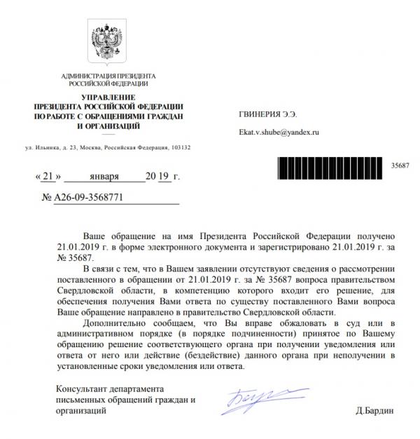 В данный момент жители Заречного также отправили Путину обращение со 150 подписями. Идею о том, чтобы подключить к данной ситуации главу государства, активисты обсуждали еще в день приема у замглавы Екатеринбурга по транспорту Алексея Бубнова. «Президент как узнает, что у нас так по хамски отменили 024 маршрутку, так у него волосы дыбом встанут. Сразу тут всех поувольняет», — говорил 17 января 2019 года один из местных жителей Александр Кропинов.