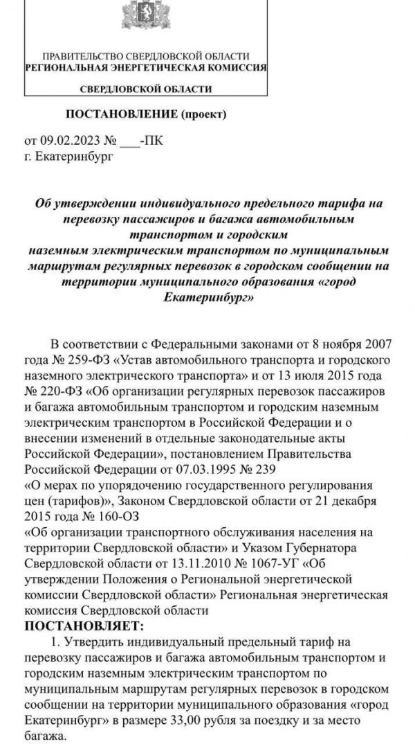 Региональная энергетическая комиссия Свердловской области подготовила проект постановления о повышение стоимости проезда в общественном транспорте Екатеринбурга до 33 рублей. Копию документа опубликовало агентство ЕАН.