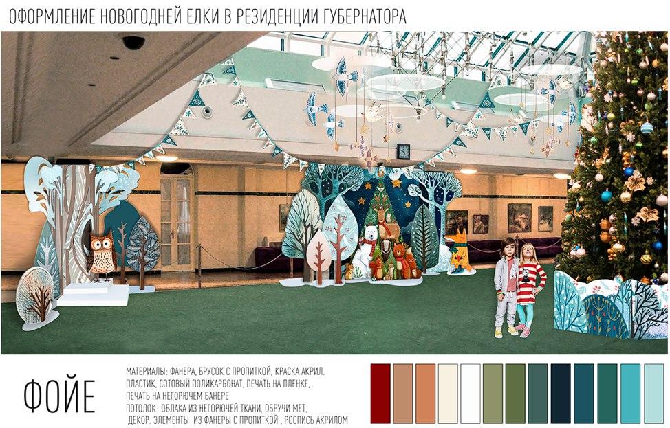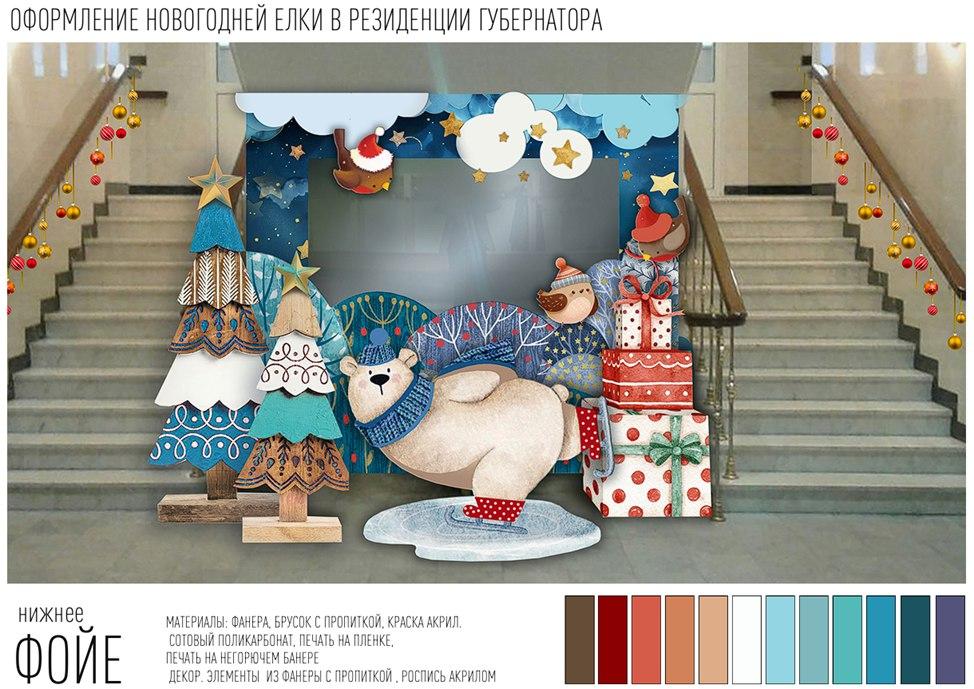 Фойе перед малым залом будет включать в себя украшение колонн, а также стилизацию некоторого пространства под фотозону, где будут располагаться различные персонажи. По всей территории будут стоять несколько деревьев в новогодней стилистике, а под одним из них расположится ящик для писем Деду Морозу.