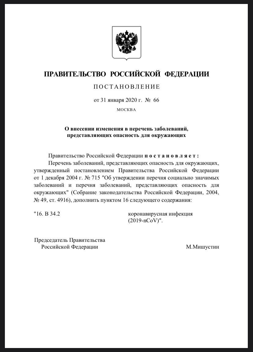 Правительство России внесло уханьский коронавирус в перечень заболеваний, представляющих опасность для окружающих. Соответствующее постановление подписал премьер Михаил Мишустин.
