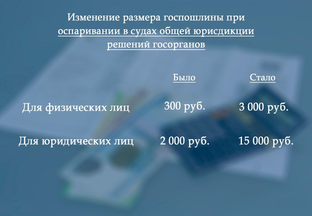 Оспорить в суде общей юрисдикции решение госорганов теперь стоит 3000 рублей (ранее 300 рублей) для физлиц и 15000 рублей для юрлиц.