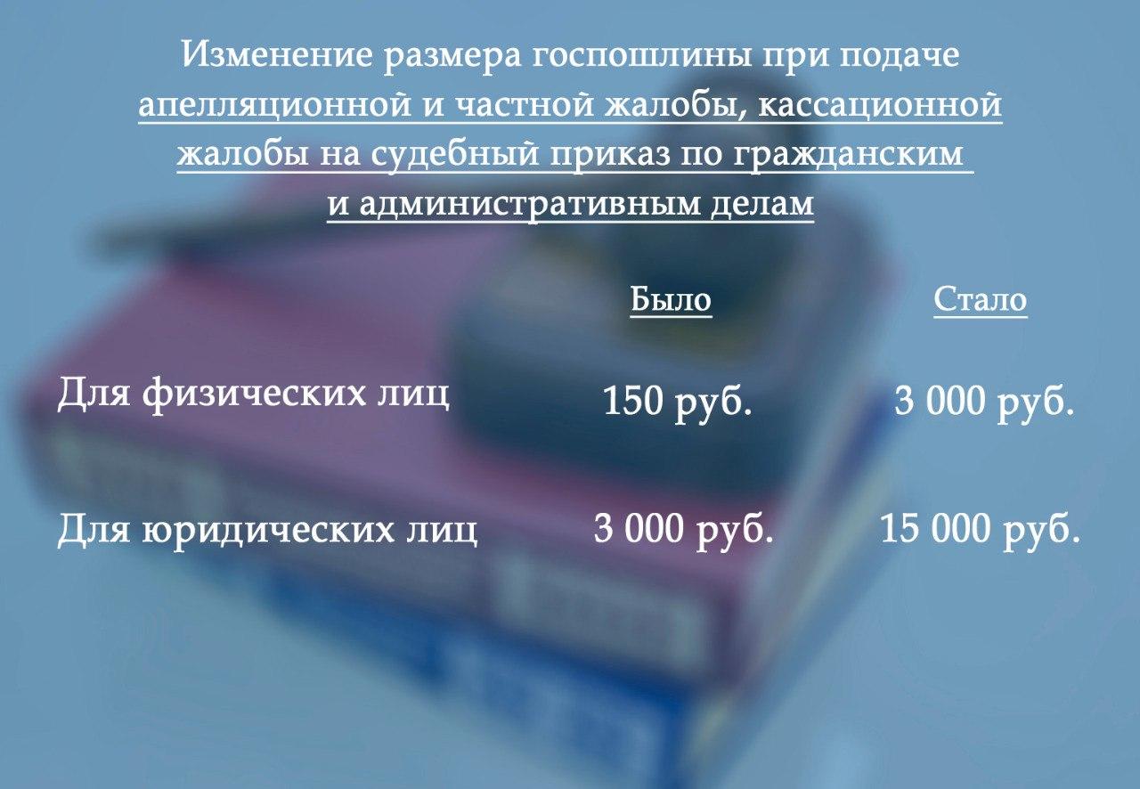 Госпошлина при подаче апелляции и частной жалобы, кассационной жалобы на судебный приказ по гражданским и административным делам увеличилась со 150 до 3000 рублей для физлиц и с 3000 до 15000 для юрлиц.