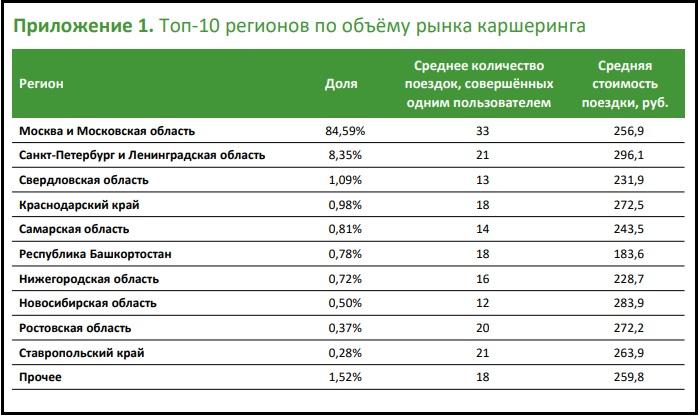В Москве пользователи каршеринга совершили в среднем 33 поездки в год, в Санкт-Петербурге и Ленинградской области — 21 поездку, в Свердловской области – 13.