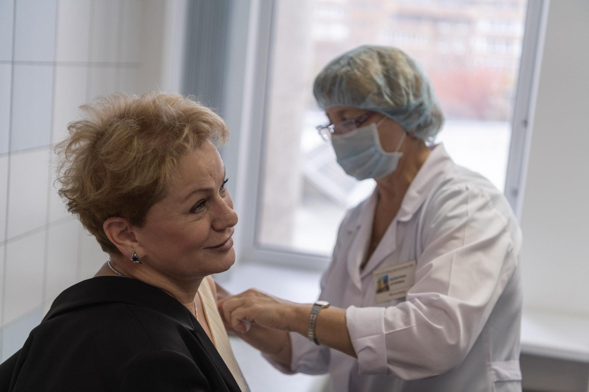 Министры правительства Свердловской области присоединились к прививочной кампании и в четверг, 10 октября поставили себе прививки от гриппа. Поставить вакцину сегодня в медкабинете Белого дома мог каждый. В числе желающих оказались и некоторые члены кабмина. В объектив фотографа департамента информполитики попали два министра – Василий Старков и Светлана Учайкина.