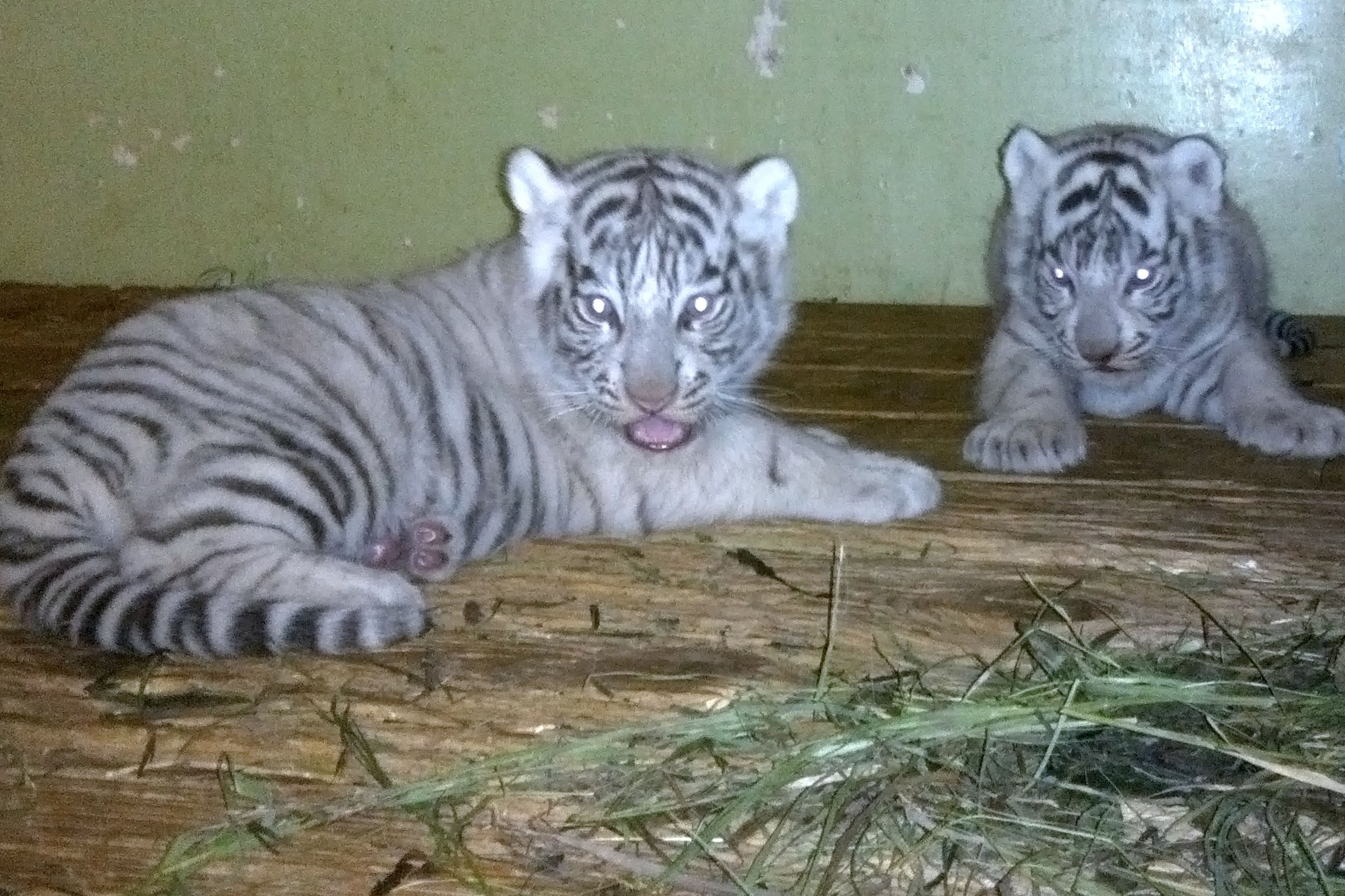 Белый тигр — вариация окраски бенгальского подвида тигров. Они появляются на свет с частотой примерно 1 на 10000 рождений. В природе их не встречали с 50-ых годов прошлого века. По миру сейчас порядка 130 особей. Тигрица Екатеринбургского зоопарка, включая этих двух детёнышей, родила уже 13, принося потомство каждый год. В России белые тигры успешно размножаются в Москве и в Екатеринбурге.