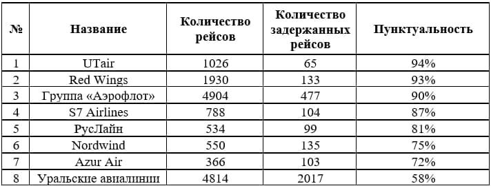 В рейтинг вошли авиакомпании, совершавшие больше одного вылета из екатеринбургского аэропорта в день. Задержкой считалось отклонение более чем на 15 минут от расписания без учета отклонений, произошедших по метеоусловиям.