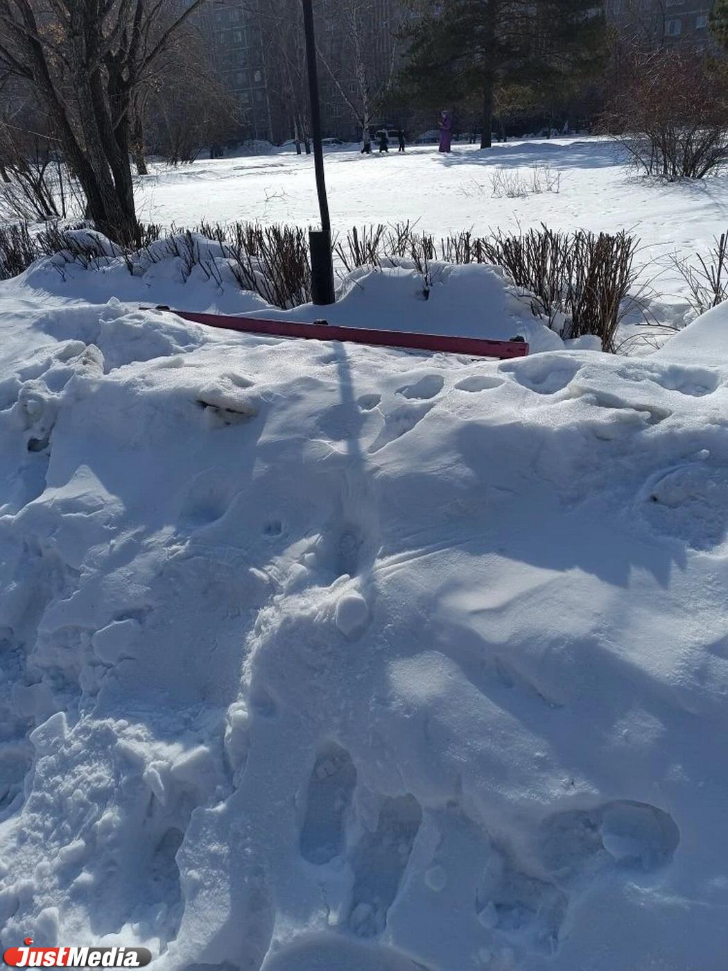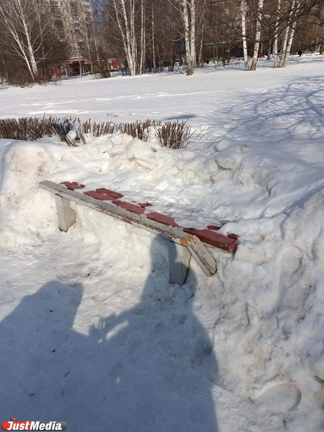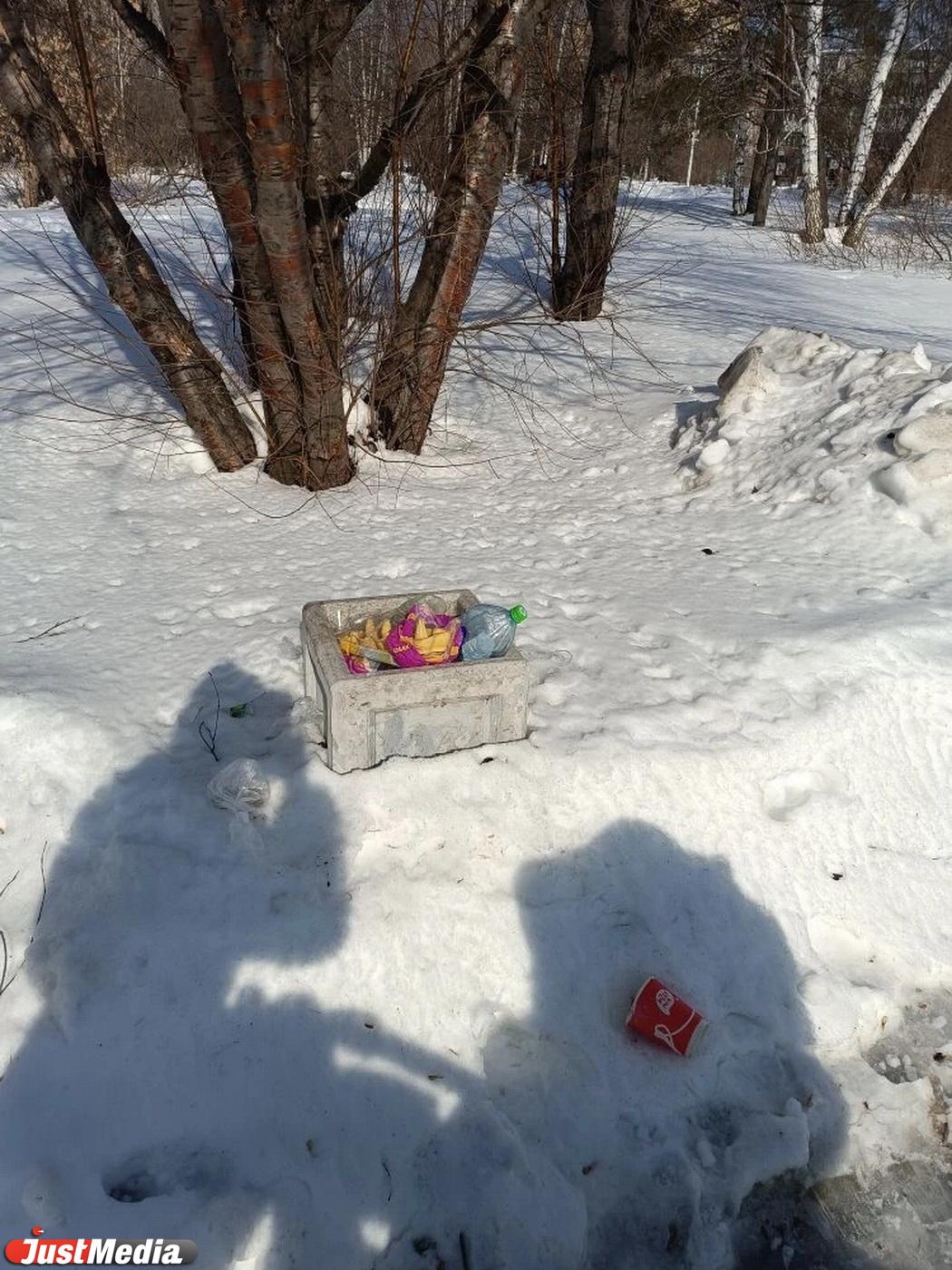 В Екатеринбурге жители ЮЗа пожаловались на отсуnствие уборки в парке Архипова. По их словам, урны переполнены, и их содержимое по территории парка растаскивают птицы. Скамейки превратились в сугробы и на них невозможно присесть.