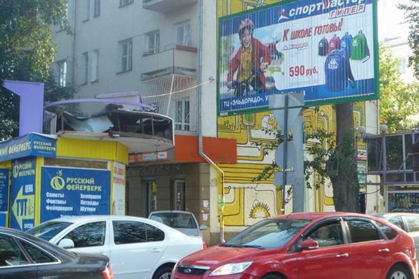 В центре Екатеринбурга на перекрестке улиц Хохрякова—Попова предприниматель незаконно поставил киоски «Фейерверки» и «Продукты». Причем, как бы упиваясь своей безнаказанностью, поставил их прямиком на газон. Кинул кабель высокого напряжения до ближайшего жилого дома и начал бойкую торговлю пиротехникой и пивом. Уборкой мусора тоже не заморачивается — черные полиэтиленовые пакеты продавцы выставляют прямо перед домом.