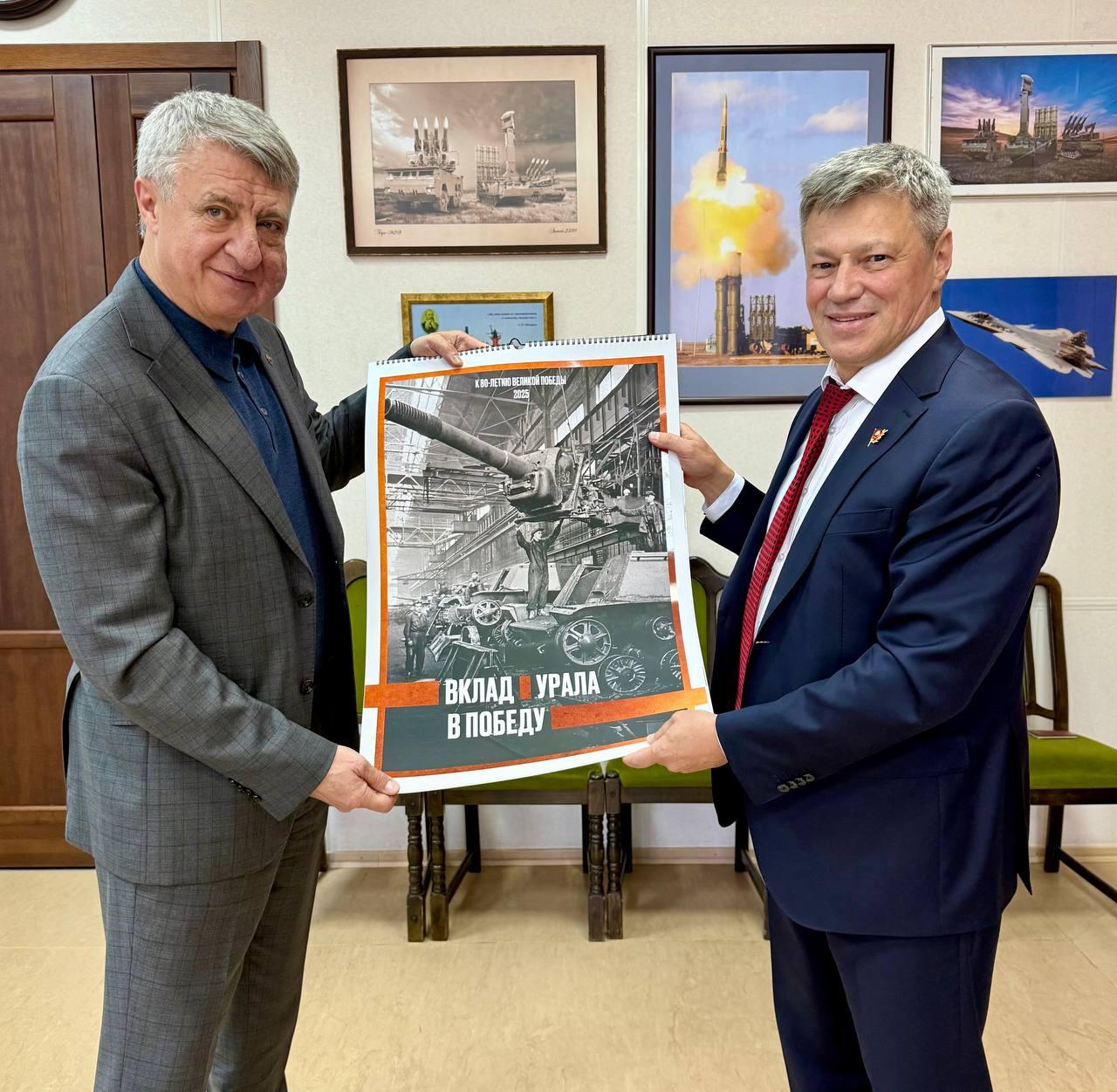 Виктор Бабенко вручил Андрею Ветлужских разработанный их организацией календарь о трудовых подвигах уральцев в годы войны.
