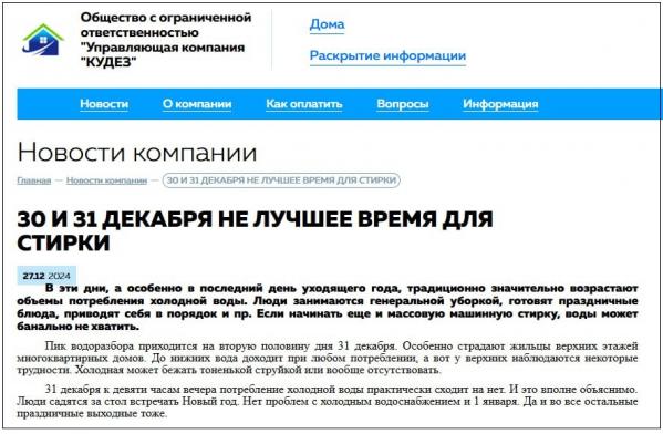 Управляющая компания «КУДЕЗ» в Каменске-Уральском на своем официальном сайте попросила местных жителей воздержаться от стирки 31 декабря, чтобы всем хватило холодной воды.