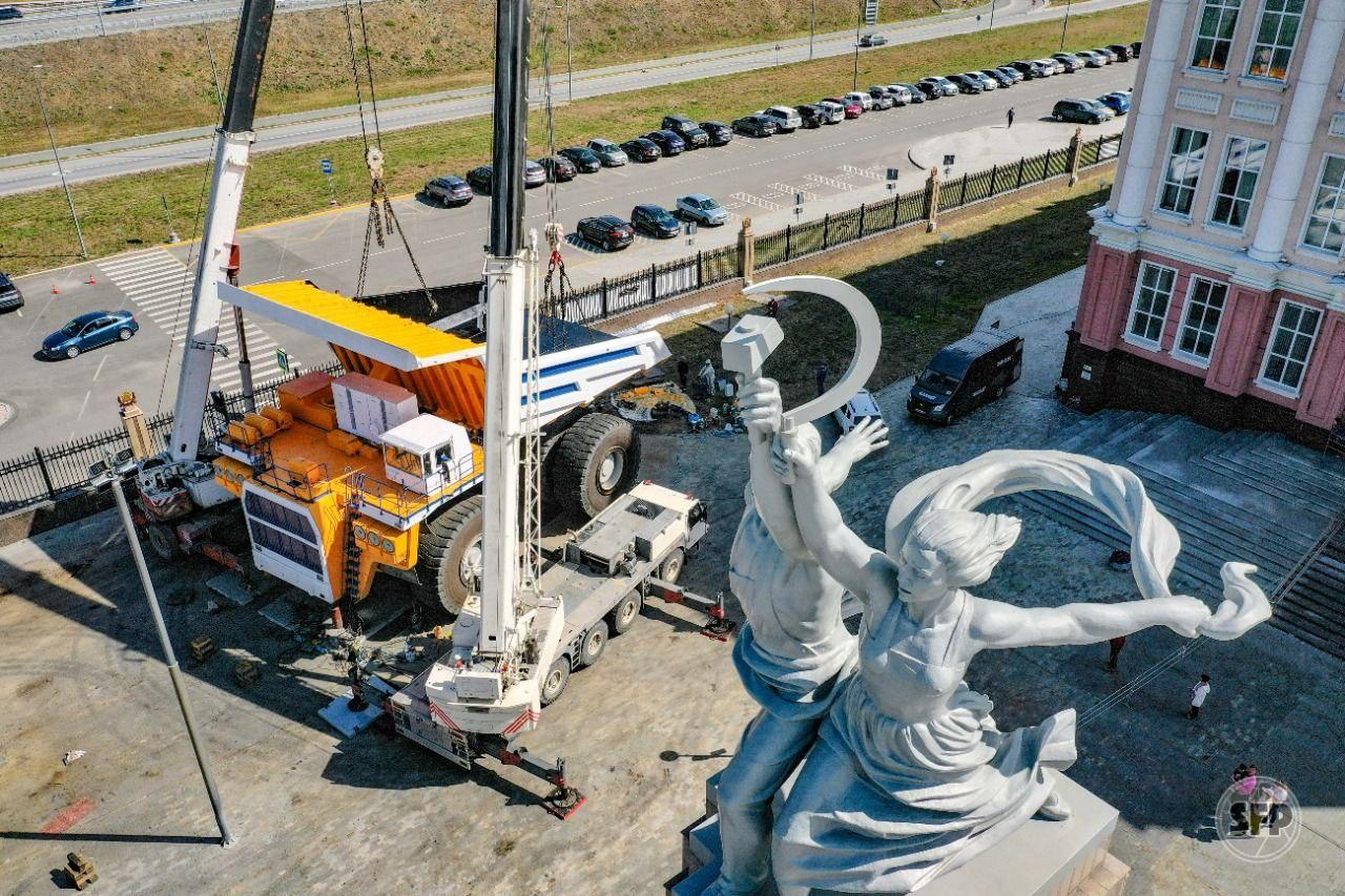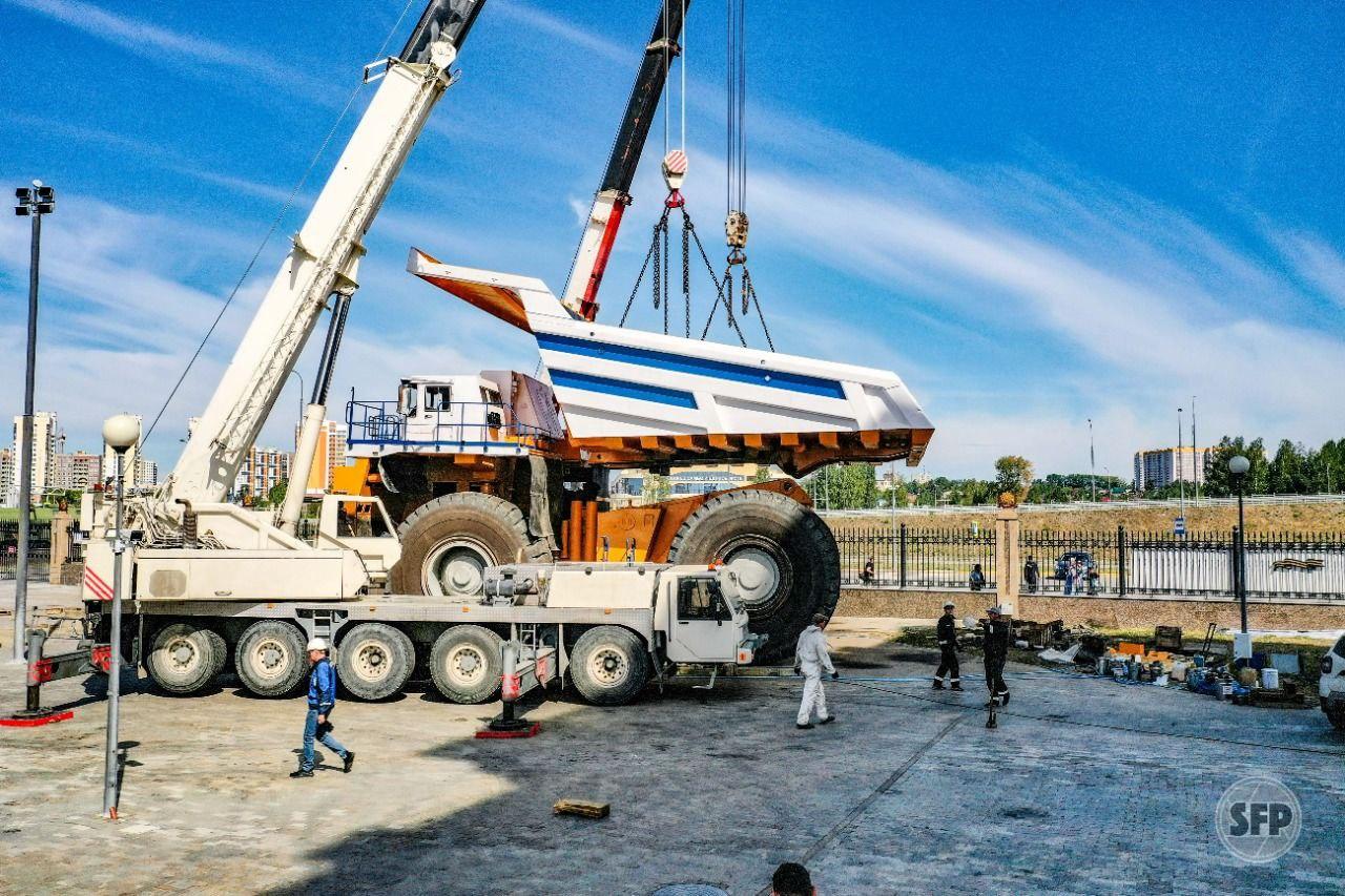 Чтобы собрать БелАЗ, потребовалось несколько подъемных кранов грузоподъемностью 25 – 70 тонн. На сборку у бригады из 4-х человек ушло две недели, ее заключительным этапом стал монтаж кузова, грузоподъемностью 320 тонн, для чего понадобился уже 100-тонный кран.