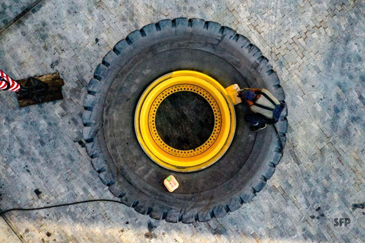 Самосвал имеет электромеханическую трансмиссию. Это значит, что его огромный 18-цилиндровый дизельный двигатель мощностью 3,5 тысячи лошадиных сил служит для выработки тока в генераторе, который, в свою очередь, питает два электромотора, вращающие колеса. Двигатель разместят отдельно в одном из выставочных павильонов. Впрочем, даже если бы БелАЗ был на ходу, ехать в Верхней Пышме ему некуда: для движения этого исполина нужны дороги шириной не меньше 20 метров.