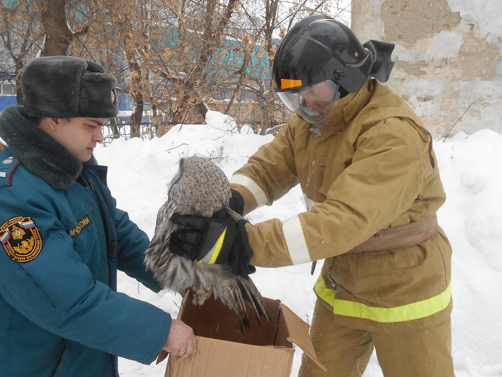 Пожарные взяли сову, посадили в коробку и привезли на территорию пожарной части. Там спасатели накормили ее свежим мясом, дали ей отдохнуть и отпустили в лес.