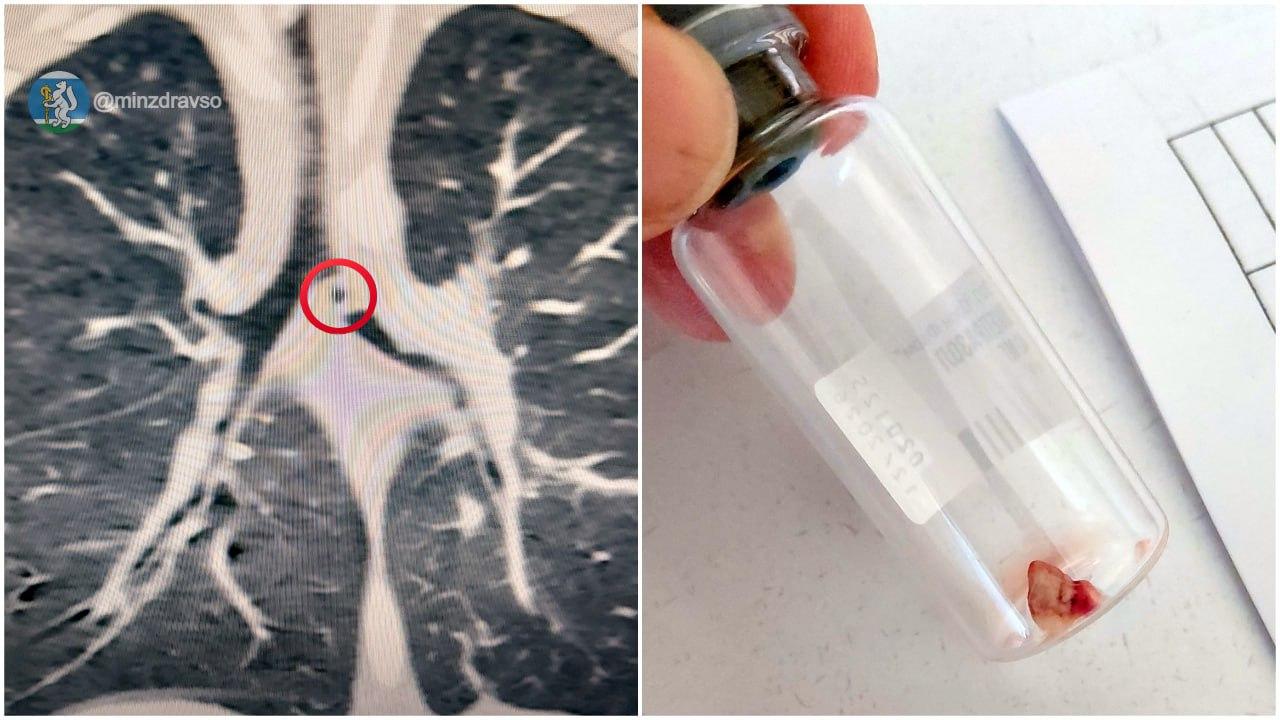Состояние малыша оставалось нестабильным и крайне тяжёлым. Врачи заподозрили аспирацию инородного тела, хотя на рентгене его видно не было. Ребенка перевезли в отделение анестезиологии-реанимации для детей СОКБ №1. Там врачи выполнили маленькому пациенту КТ и на снимках увидели участок сужения в левом бронхе. Затем с помощью сверхтонкого бронхоскопа медики обнаружили инородное тело. Была проведена операция. После нее пациент провёл в кардиореанимации ещё сутки на ЭКМО и неделю — на ИВЛ, затем его перевели в отделение детской кардиохирургии.