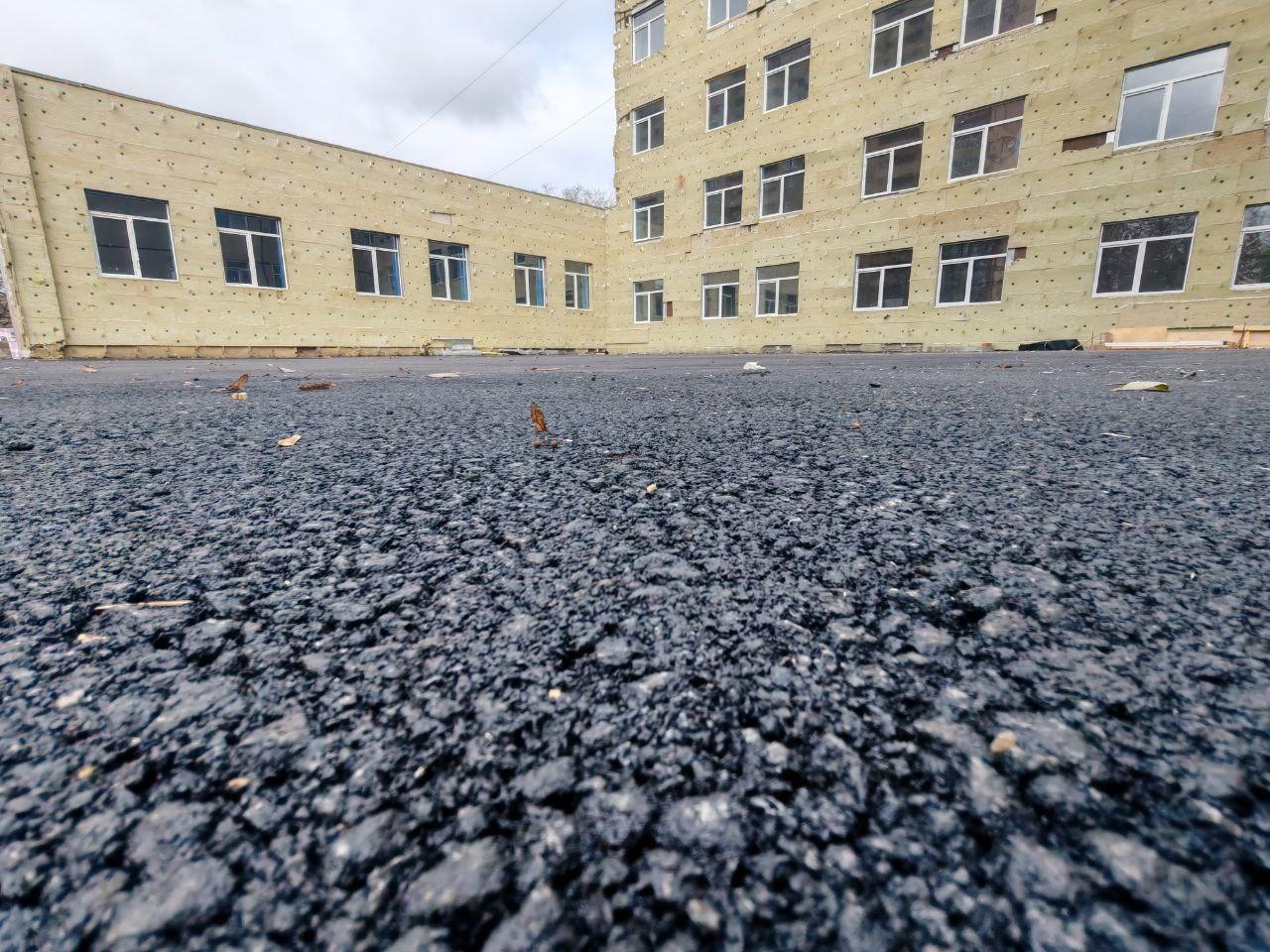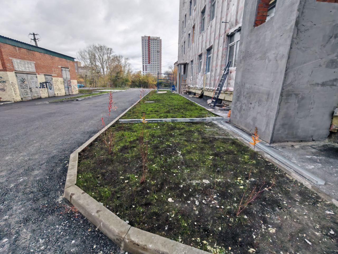 На тротуарах перед медучреждением уже уложили асфальт. Также на прилегающей территории оформили газоны, высадили кустарники, по периметру установили ограждение.