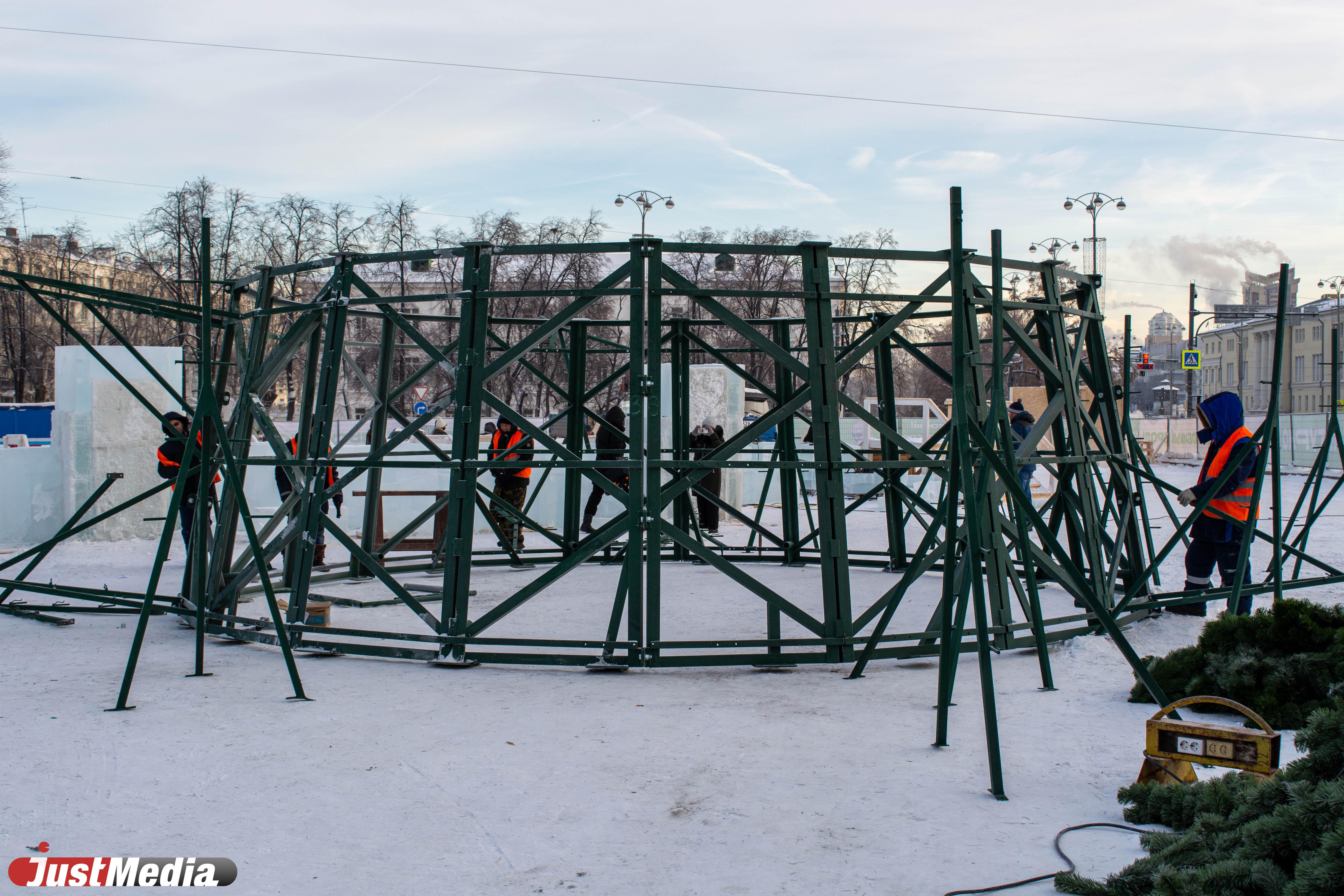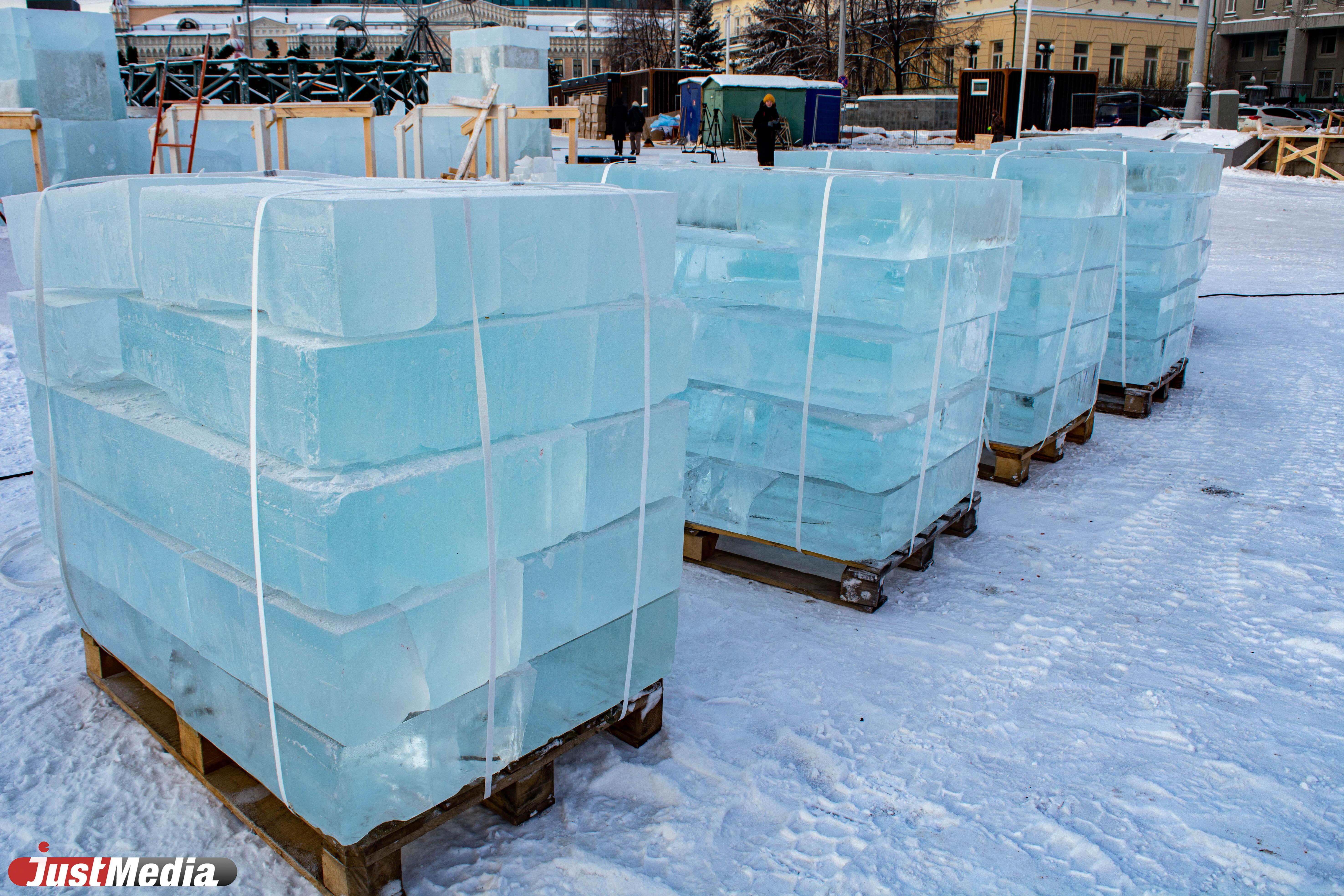 В Екатеринбурге вовсю идет строительство главного ледового городка на площади 1905 года. В этом году он будет посвящен сказкам Александра Пушкина, а также 300-летию уральской столицы. Уже сейчас рабочие установили некоторые аттракционы, поставили деревянное основание высокой горки и вовсю выпиливают из ледяных кубов монументы, которые будут напоминать о Петропавловской крепости и Казанском соборе.