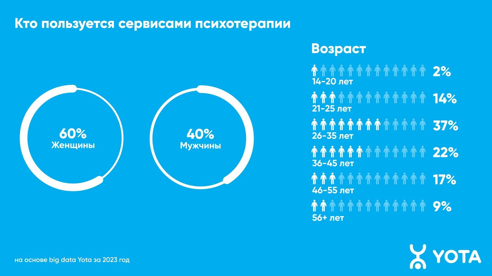 В Екатеринбурге, как и в целом по стране, психологическими сервисами чаще пользуются женщины, они составляют 60% аудитории и обеспечивают 63% интернет-трафика этих ресурсов. Наибольший интерес к онлайн-психологии проявляет аудитория 25-35 лет (37% от всех пользователей). На втором месте — абоненты от 36 до 45 лет (22%), а замыкает топ-3 группа 46-55 лет (17%).