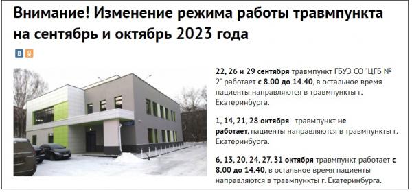 6, 13, 20, 24, 27, 31 октября травмпункт работает с 8:00 до 14:40, в остальное время пациенты направляются в травмпункты Екатеринбурга.