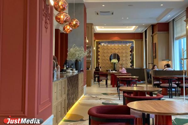 После пресс-релизов ожидались ажиотаж и полная посадка, но в 10 утра больше половины столиков были свободны. Нас встретили и проводили за стол. Первое, что начинаешь оценивать - это интерьер. Он выполнен в красно-оранжевых тонах с деревянными элементами. Хорошо смотрятся круглые столы с округлыми спинками кресел, посадка не слишком частая, можно комфортно расположиться. Простое название объясняют тем, что не хотят отвлекать посетителей от еды, но красный цвет как-то выбивается из этой концепции. Отвлекающим нюансом еще становится то, что кафе находится между ресепшеном Ривьеры и фитнес-клубом, и пока ты завтракаешь, можно наблюдать отзанимавшихся людей, выходящих из зала с сумками. Они снуют по кафе, как по коридору.