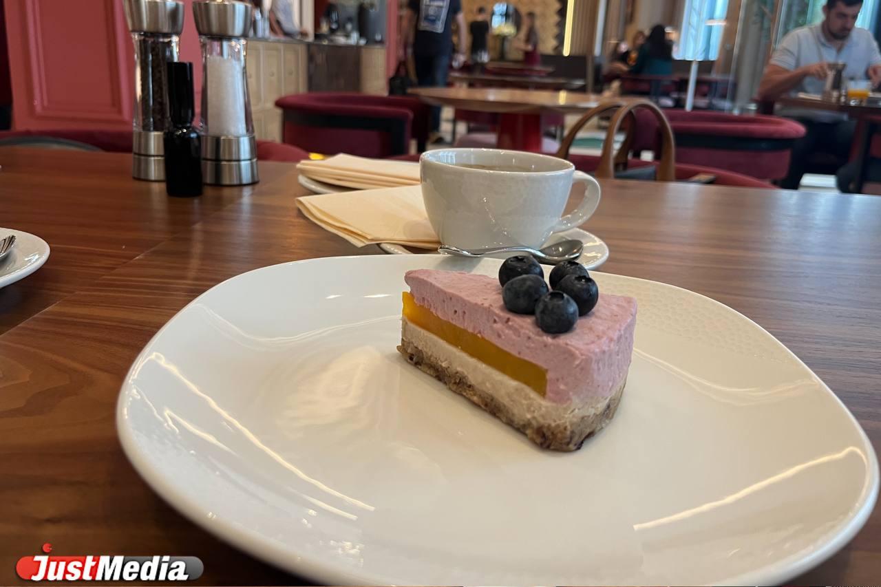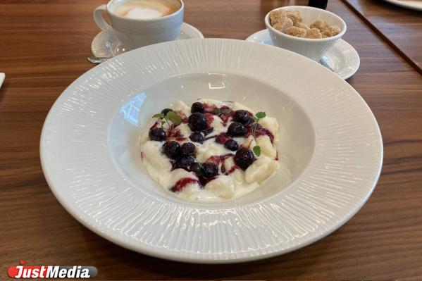 Меню небольшое, цены достаточно высокие, в завтрак не входит напиток, самая дешевая позиция - глазунья из трех яиц - ₽250, блюда поинтереснее ₽370 - 600. Позиции с крабом ₽590-970. Я хотела попробовать тост с сезонными ягодами (₽430), подруга присмотрела пп-торт малина-манго (₽390). При заказе оказалось, что торта нет, через 15 минут выяснилось что тост приготовить не могут, но торт чудесным образом появился. Пришлось выбрать творожные ньоки с голубикой (₽450). Из напитков выбрали капучино (₽250) и американо (₽150). Официантка принесла сначала американо и поставила его, назвав капучино. Капучино же принесли чуть позже. Кофе средненький, молочная пенка слишком пористая, без рисунков.