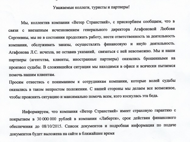 «Мы не в состоянии продолжать работу, нести ответственность за деятельность компании, обслуживать заказы, осуществлять финансовую и иную деятельность. Агафонова Л.С исчезла, не оставив указаний, связаться с ней невозможно. В сложившейся ситуации мы находимся в офисе и всячески пытаемся помочь нашим клиентам», — говорится в сообщении.