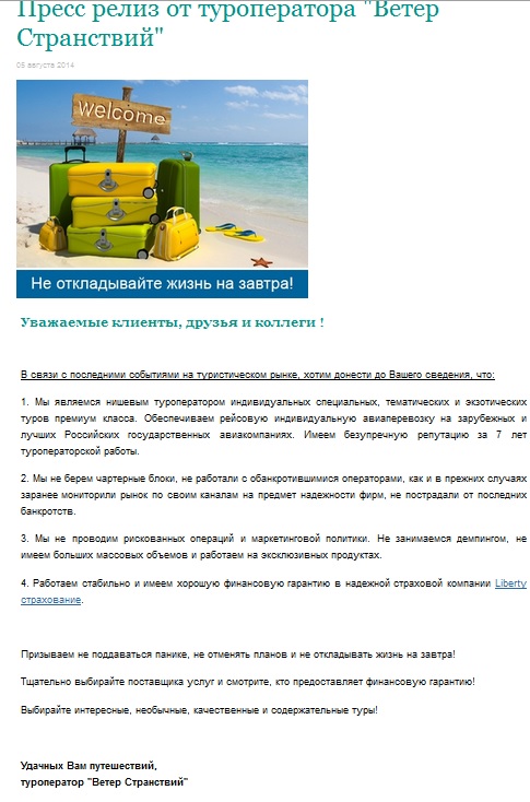 Стоит отметить, что еще 5 августа турагентство призывало россиян не поддаваться панике в связи с массовым уходом с рынка ряда компаний и заказывать туры через их компанию, успешно существующую уже 7 лет.