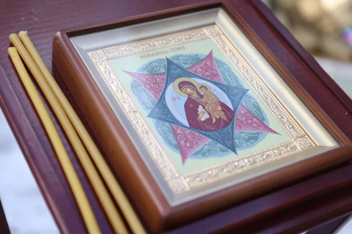 Икона «Неопалимая Купина» рассказывает о явлении пророку Моисею на горе Хорив (Синай) горящей, но не сгорающей купины (куста), что толкуют как прообраз Богоматери. Икона образована двумя четырехконечными звездами, наложенными друг на друга, в центре которых находится Божья Матерь с Младенцем Христом.