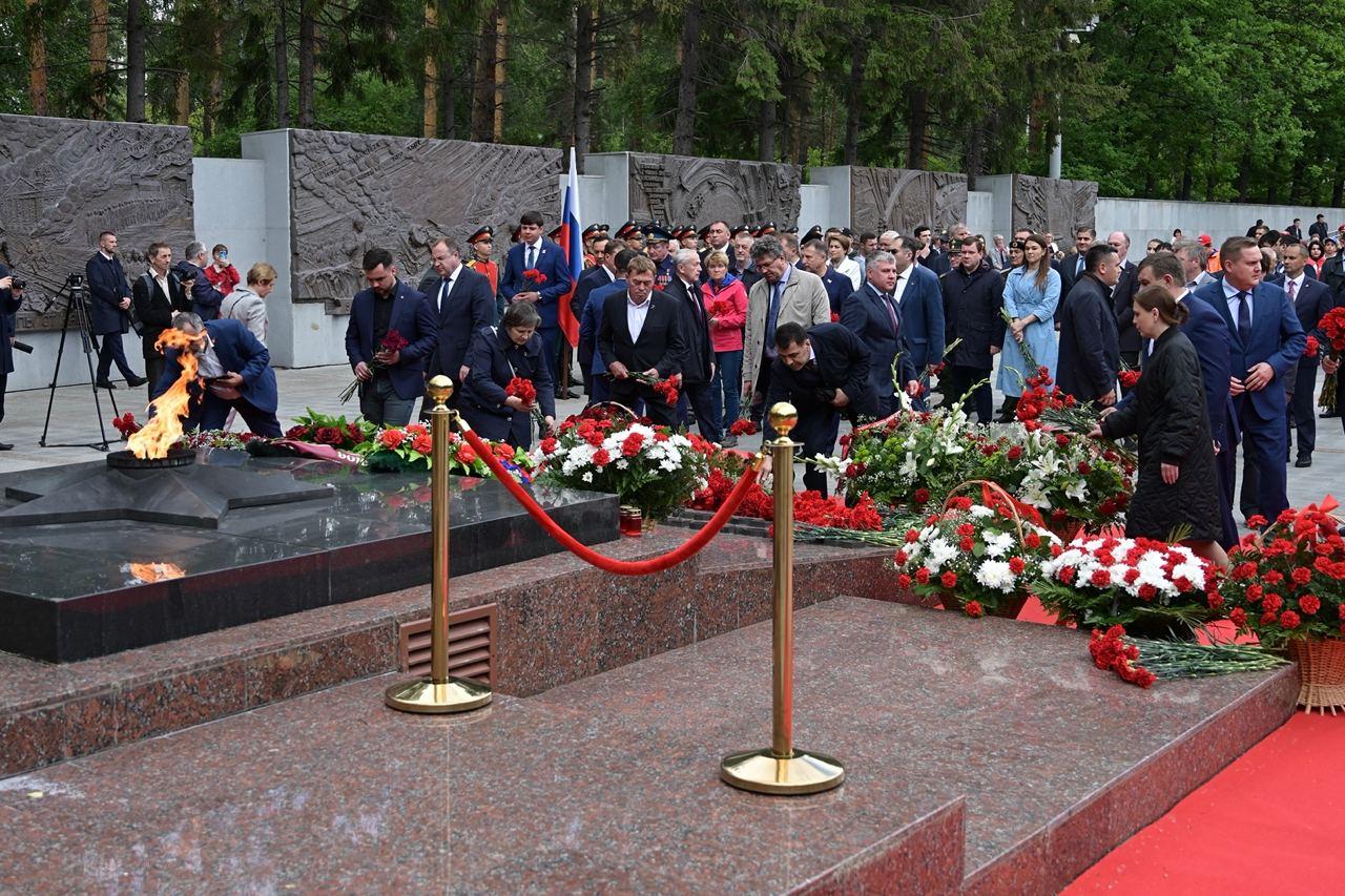 Цветы к Вечному огню возложили губернатор Евгений Куйвашев, заместитель командующего войсками ЦВО Рустам Миннекаев, полпред Президента УрФО Владимир Якушев, заместитель командующего Уральским округом войск национальной гвардии по военно-политической работе Александр Голосов, председатель свердловского Законодательного Людмила Бабушкина, настоятель Преображенской церкви протоиерей Николай Ладюк, председатель Духовного управления мусульман Свердловской области Муфтий Абдуль-Куддусс, главный раввин Екатеринбурга и Свердловской области Зелиг Ашкенази, глава города Алексей Орлов, председатель гордумы Екатеринбурга Игорь Володин, члены общественной палаты Свердловской области, представители дипломатического корпуса, ветеранских организаций, российского движения школьников, юнармейцев, поисковых отрядов.