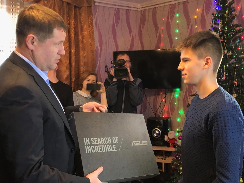 Еще один юный житель Карпинска 15-летний Глеб Павлович мечтал о компьютере или ноутбуке. Современная техника нужна юноше для того, чтобы подготовиться к вступительным экзаменам в вуз – мальчик хочет учиться на факультете информационных технологий. По поручению главы региона Евгения Куйвашева подарок Глебу вручил заместитель губернатора Свердловской области Сергей Бидонько.