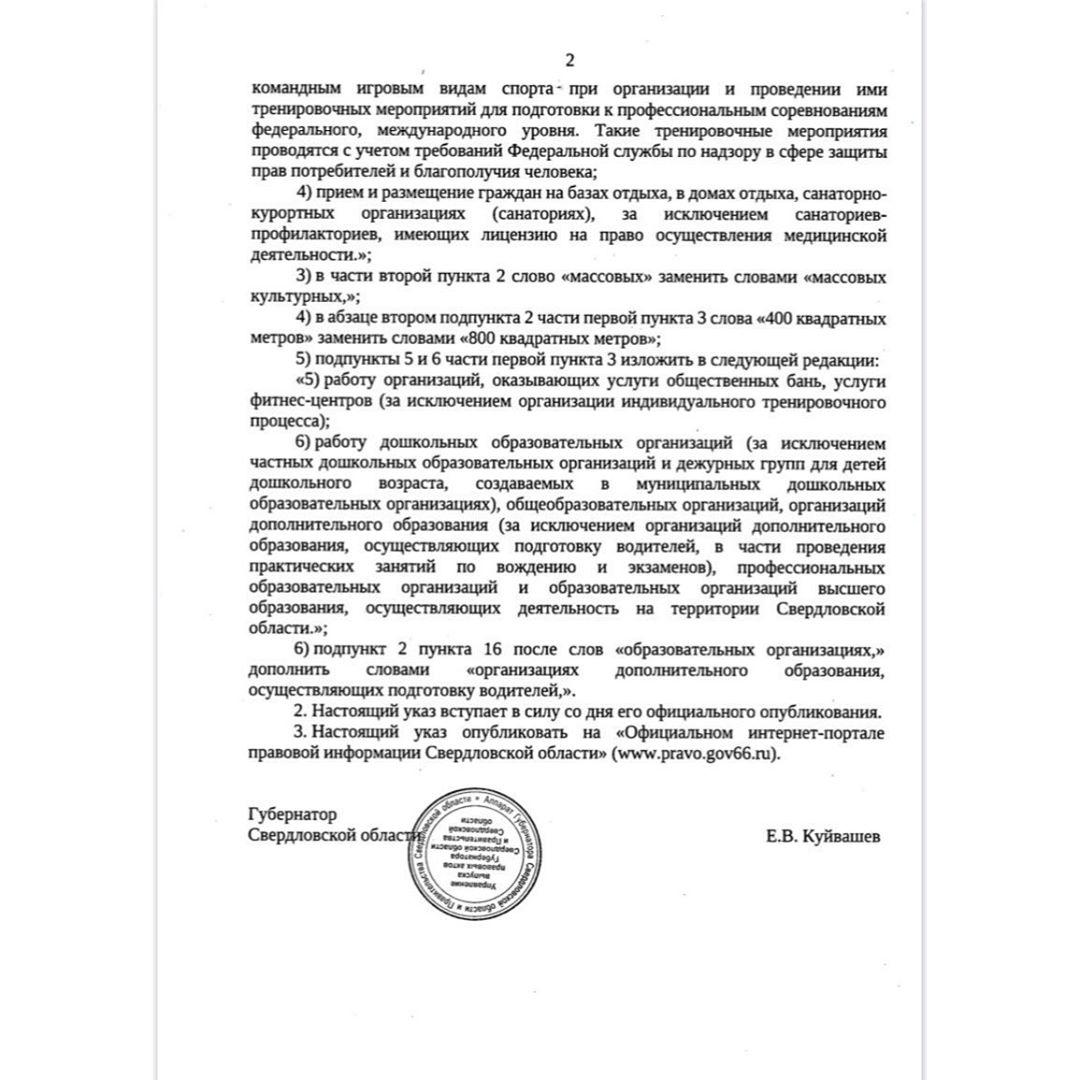 Губернатор Свердловской области Евгений Куйвашев продолжает снимать ограничения в связи с коронавирусом. На этот раз глава региона разрешил открыть магазины с отдельным входом площадью до 800 кв. метров, библиотеки, автошколы для практических занятий по вождению и для сдачи экзаменов. Профессиональные спортивные клубы cмогут приступить к тренировкам на своих спортивных базах. Соответствующий указ он выложил у себя в Инстаграме.