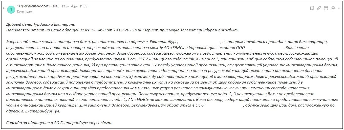 «На основании представленных документов, для проведения расчетов за электроэнергию, потребленную по указанному адресу, в «ЕЭНС» с 01.10.2025 года будет открыт лицевой счет». По факту получения клиентом иного текста ответа с отказом в заключении договора с собственником вышеуказанного МКД в октябре 2025 года инициирована проверка».