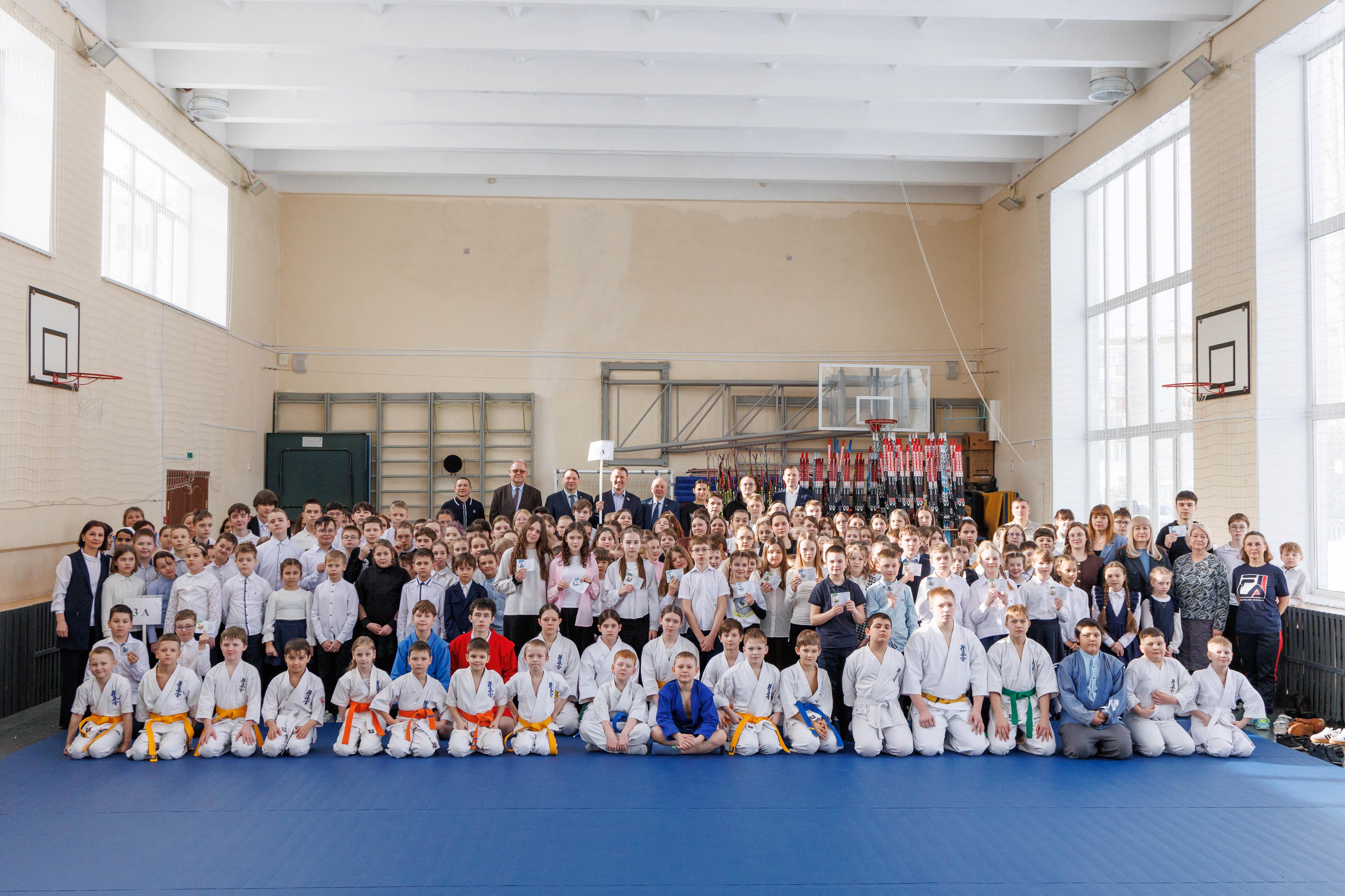 А мировые чемпионы по самбо Тимур Галлямов, Софья Истомина и Альбина Чоломбитько разделили со школьниками радостное событие.