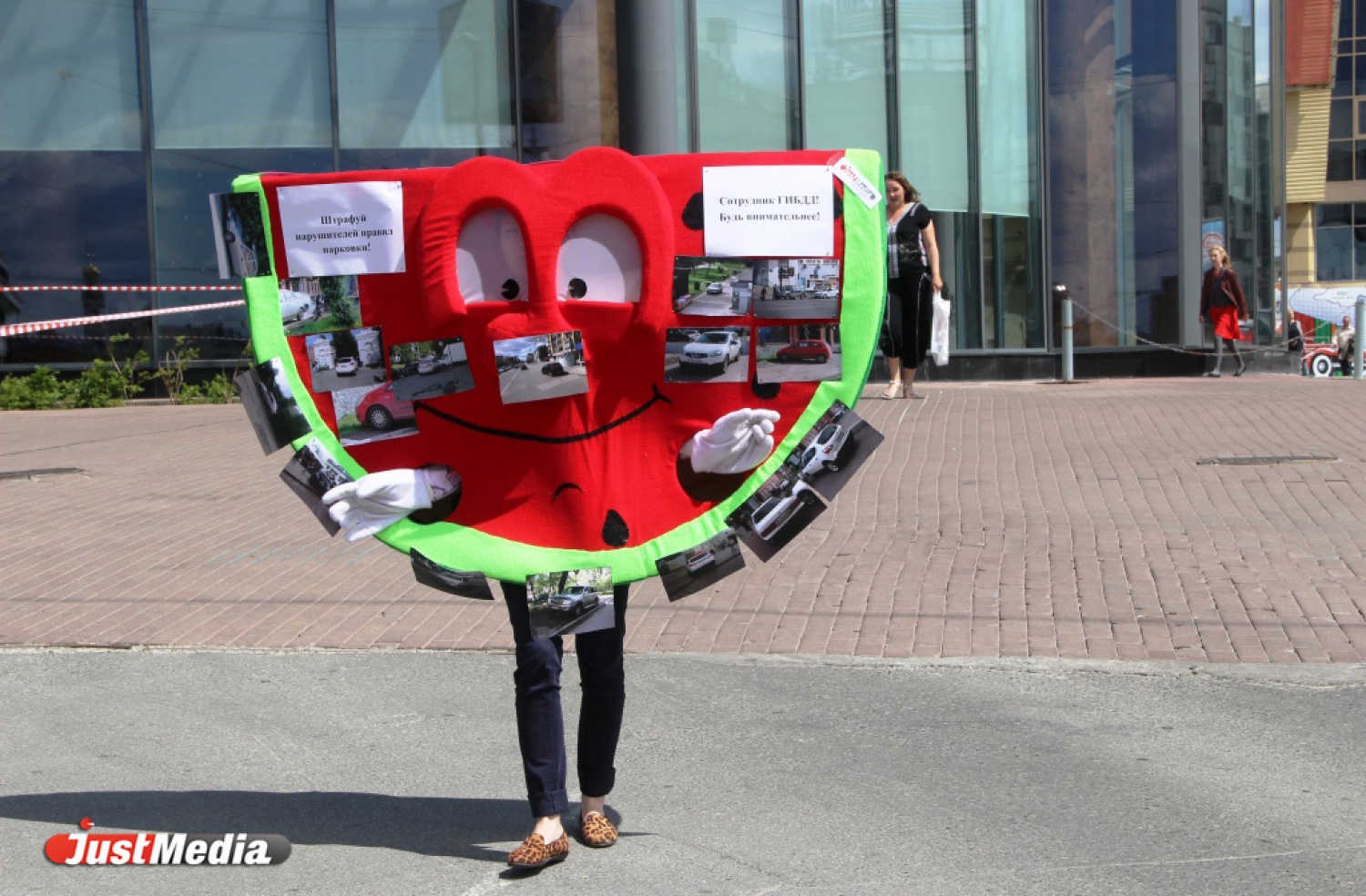 У входа в здание ГИБДД Екатеринбурга ростовая кукла арбуз устроил выставку, на которой презентовал сотрудникам автоинспекции полсотни фотографий. На снимках можно было увидеть автолюбителей, припарковавших свои машины в неположенных местах: на газонах, тротуарах и на пешеходных переходах.