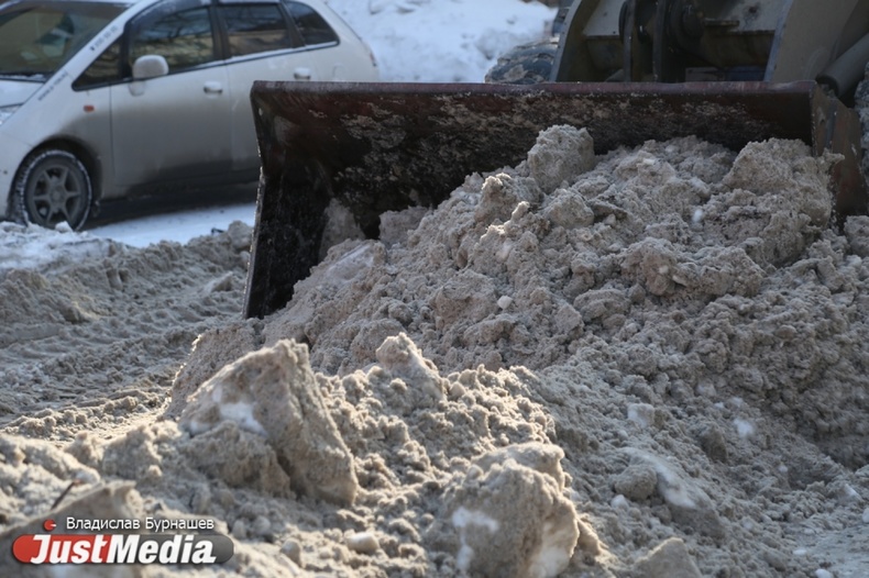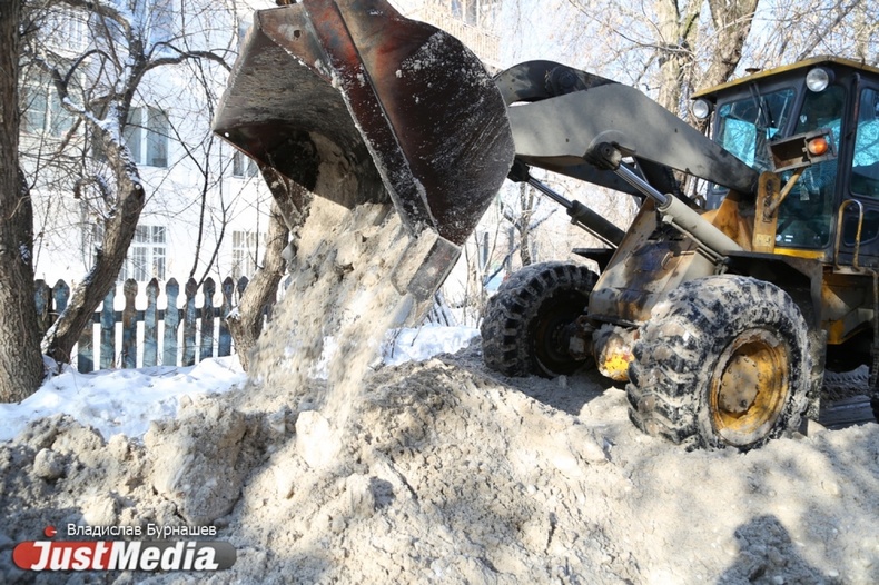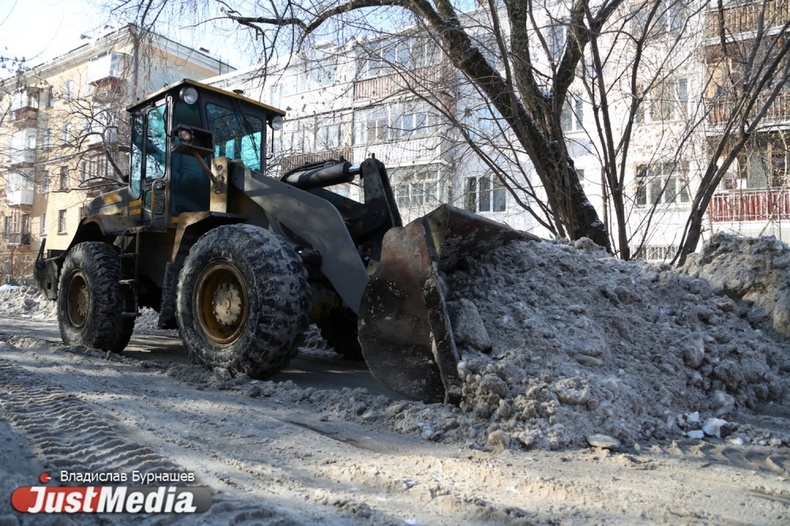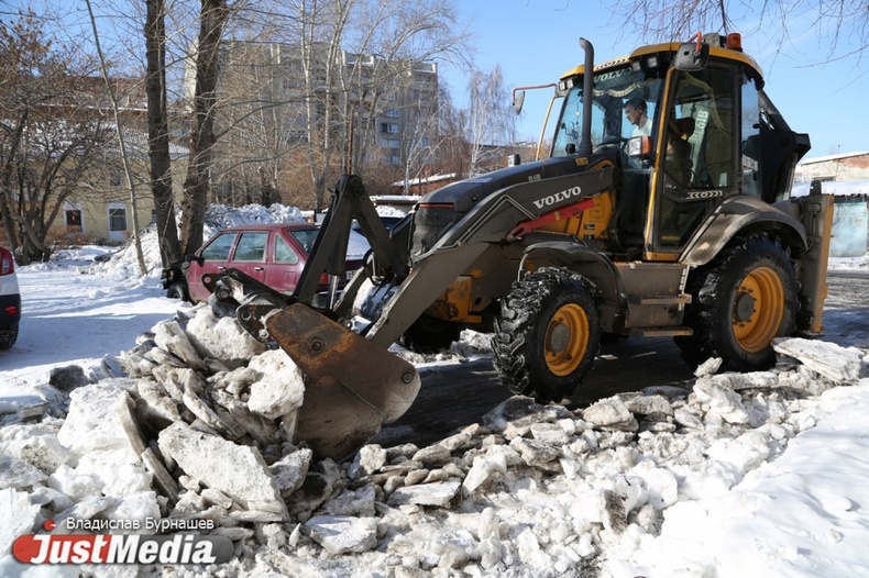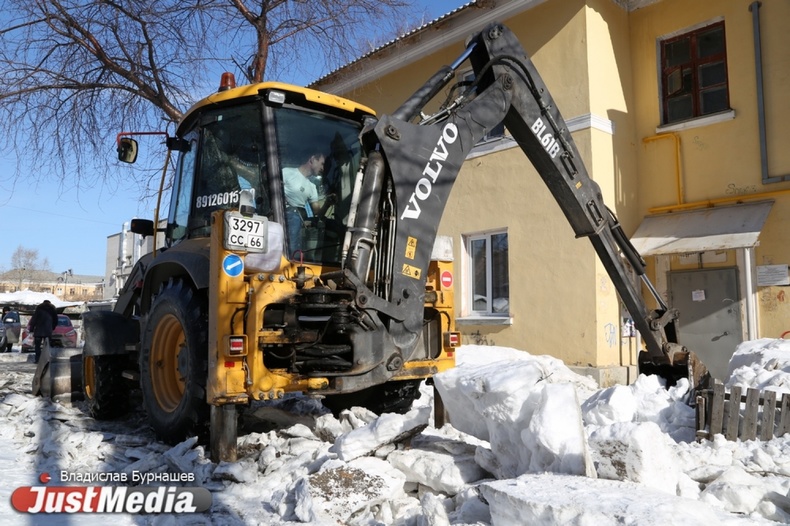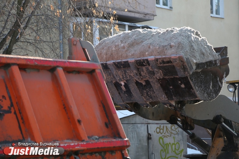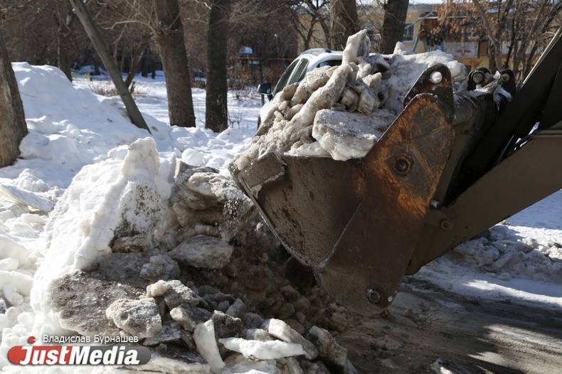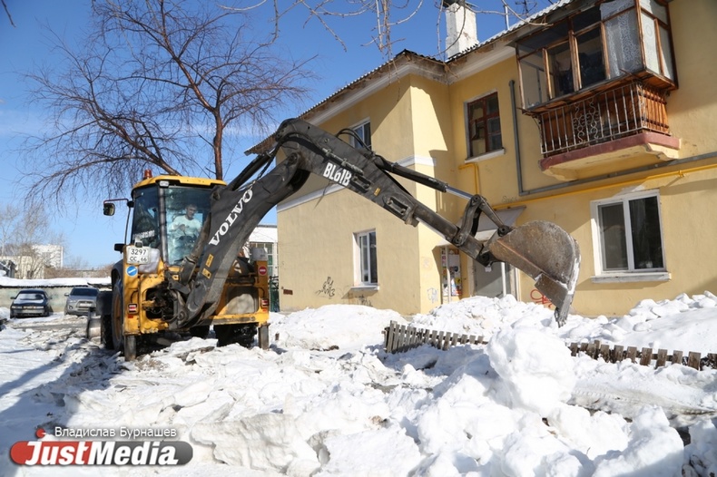 Уборка снега во дворах Екатеринбурга в первый день весны