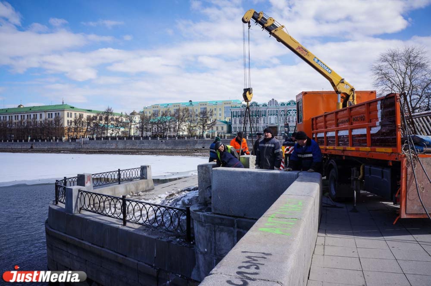 В Екатеринбурге со дна городского пруда подняли гранитный блок парапета, который вандалы сбросили в воду.