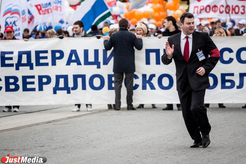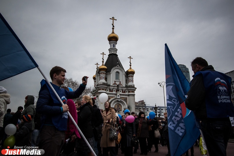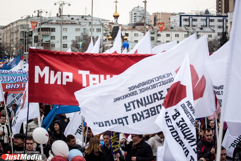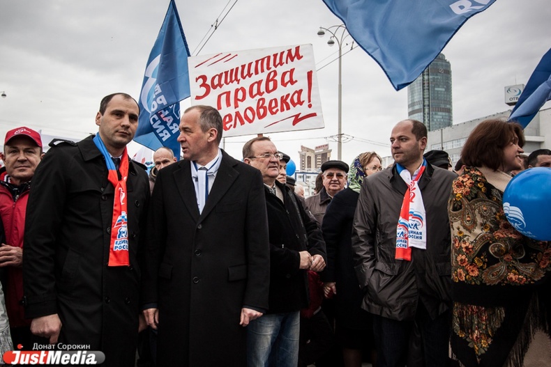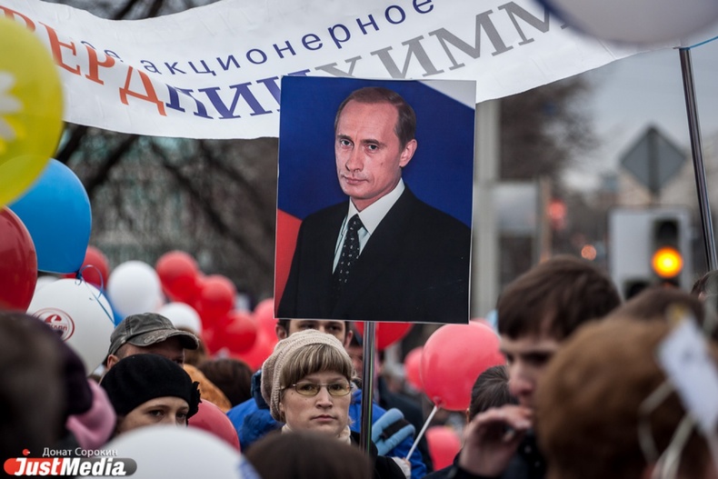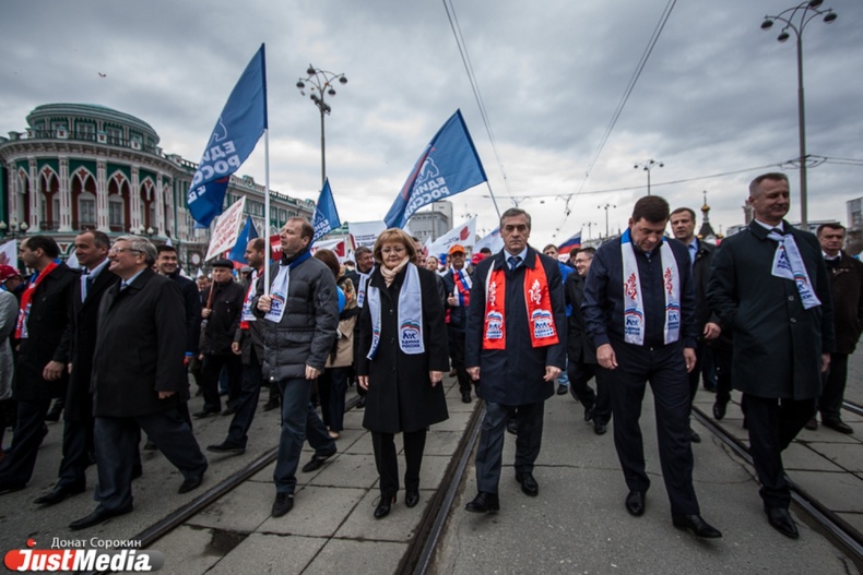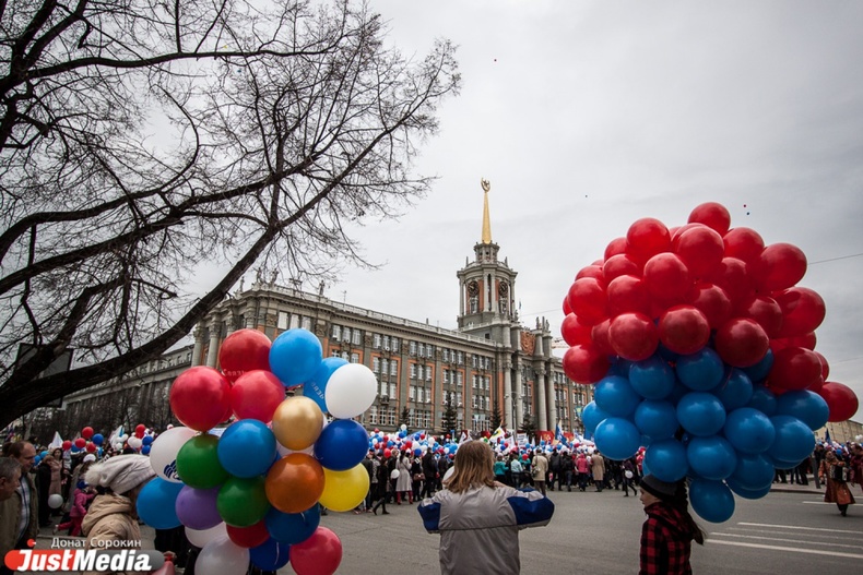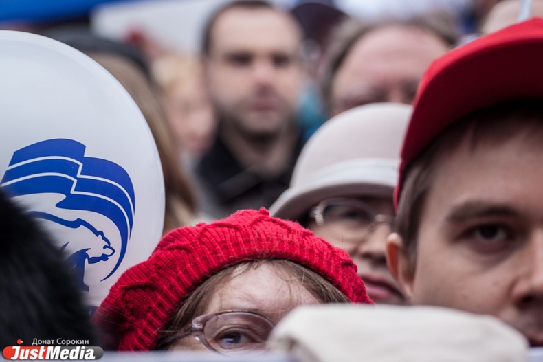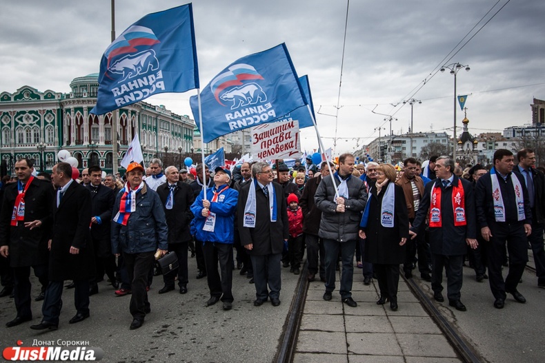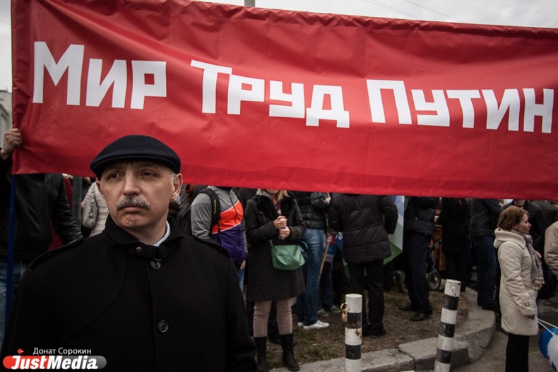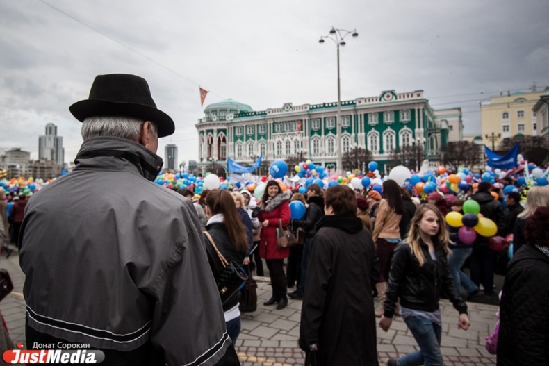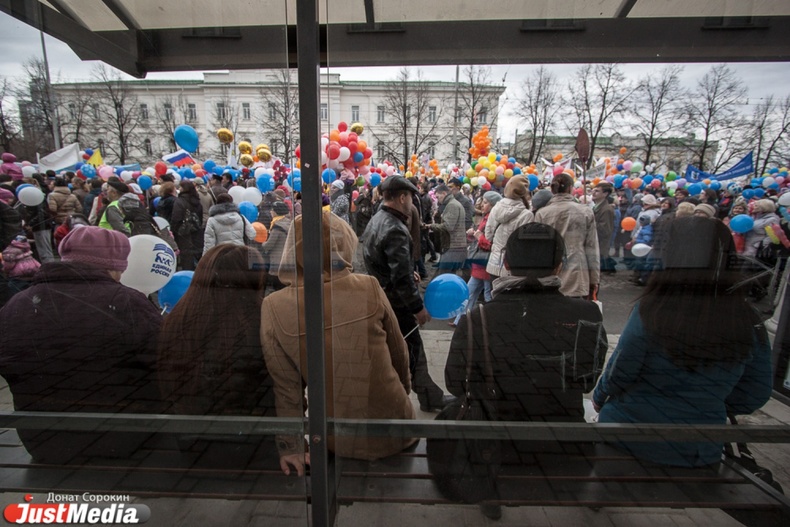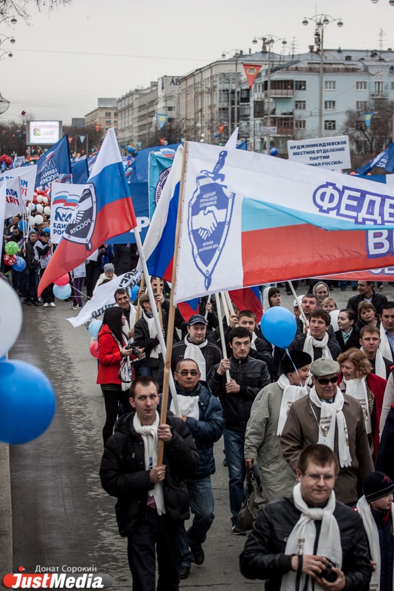 Несмотря на плохую погоду – холод и дождь, рано утром на проспекте Ленина возле дома Севастьянова и Главпочтамта собрались тысячи демонстрантов. Хотя добровольцев среди собравшихся было немного, настроение у толпы было такое же радостное и светлое, как и у их предшественников лет 30-40 назад. Те же воздушные шары, дети на плечах у родителей, патриотическая музыка. Только красный цвет сменился на синий: возглавляли колонну демонстрантов единороссы. А главный первомайский лозунг «Мир. Труд. Май» трансформировался в «Мир. Труд. Путин».