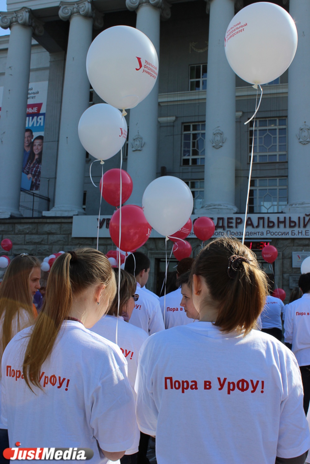 Пятничное утро JustMedia встретил в компании 11-классников Екатеринбурга. Прежде чем услышать традиционные «последние звонки», школьники собрались на площадке перед главным учебным корпусом Уральского федерального университета, который организовал для них необычную акцию — флешмоб «Пора в УрФУ!»